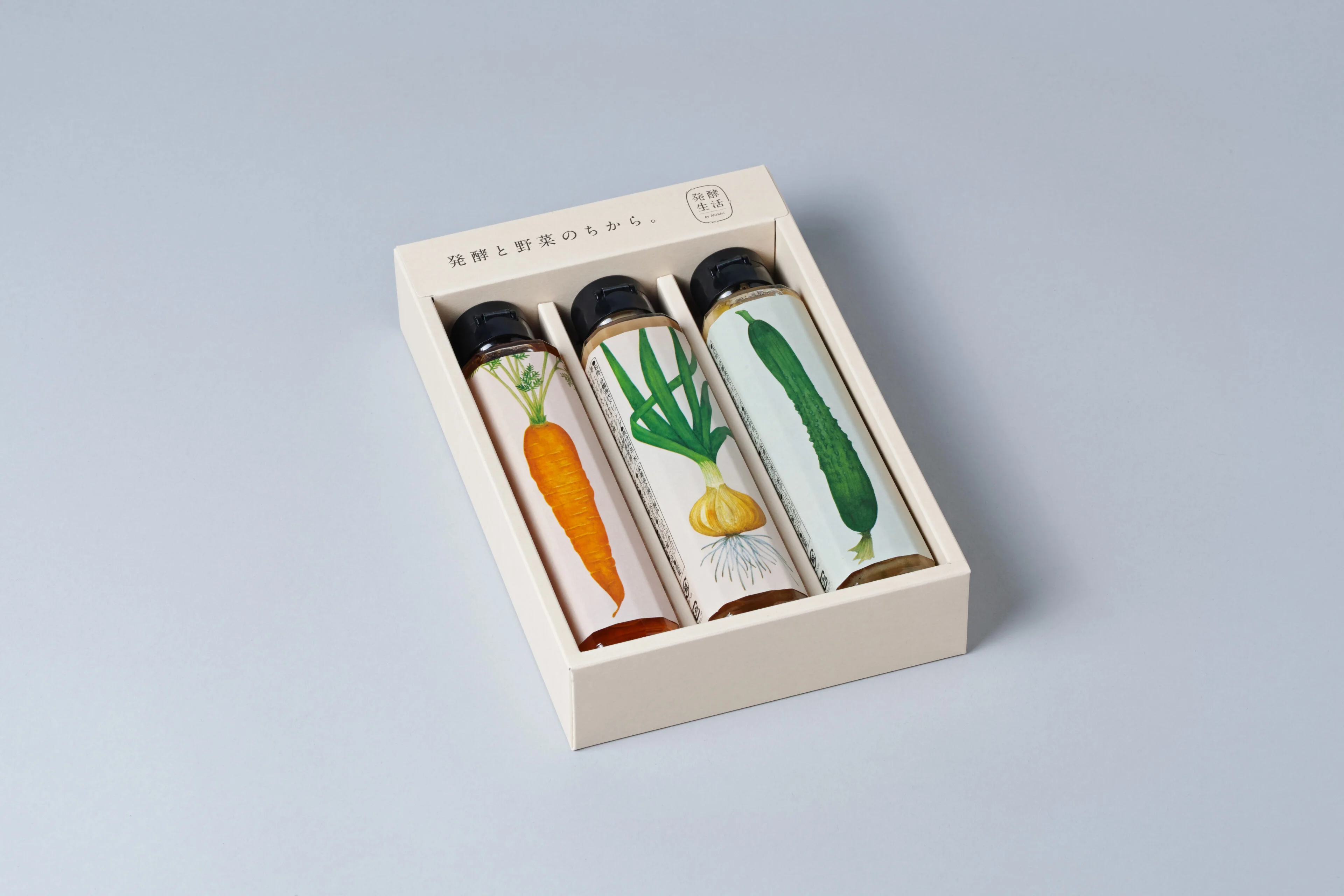 NISHIRI holds an image of a long-established shop of pickled foods. To create a new image as a brand of healthy fermented foods, we designed the package to emphasize a sense of both Japanese and Western eclecticism. We are using mainly fonts from the letterpress printing era called “Plantin,” as we wanted this brand to be a design of both Japan and Europe To make better use of the illustrations the brand initially used before the rebranding process, we separated the typography and illustrations. We carefully thought of how the products would be on shelves, making sure the illustrations and title, or only the illustrations, are facing the customer. The gift box represents bubbles, where the package design is shown through cut out holes placed at random on the surface.
