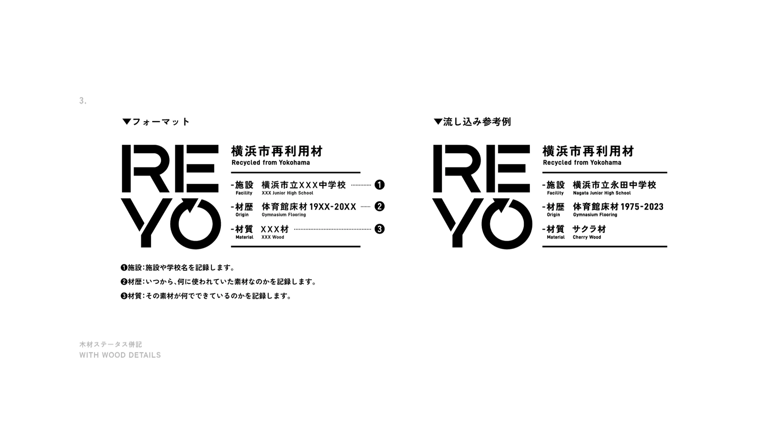 We proposed the name “REYO,” a word that echoes the Japanese pronunciation of sai-ri-you (“reuse”) while combining the ideas of Reuse and Recycle from YOKOHAMA. Under the tagline “Carrying the Materials of Memory Forward,” we developed an open-design guideline compiling the project’s philosophy, background, and examples of use. It also highlights the unique value of reclaimed hardwoods such as cherry and maple, along with the lines and marks that preserve traces of time and memory.