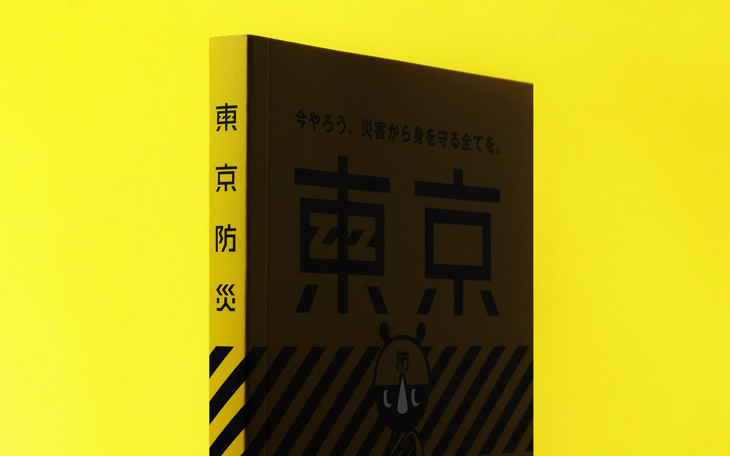 Primero que nada, utilizamos rayas amarillas y negras típicamente usadas en sitios de construcción como el conjunto principal de señales visuales para este proyecto. Para asegurar que el libro sea fácil de encontrar en caso de emergencia y que sea único de Tokio, basamos nuestros iconos clave para la prevención de desastres urbanos en un esquema de colores que es ampliamente reconocido como uno que denota la presencia de peligros. Al limitar el número de colores impresos de esta manera, el libro puede destacar de su entorno.