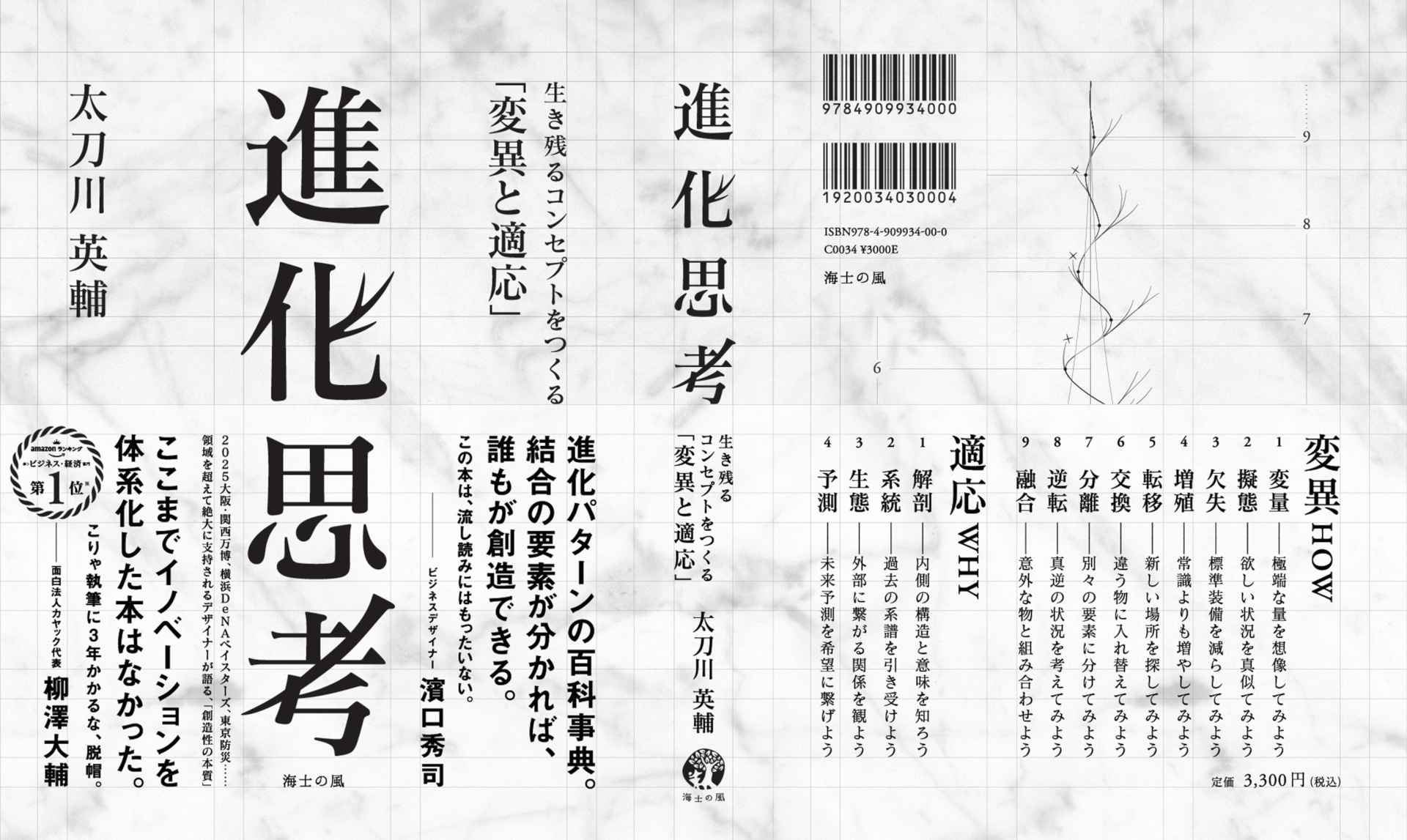El logo del título del libro muestra los cuatro caracteres kanji (進 化 思 考) en transición basados en los patrones de mutación de Creatividad Evolutiva: Proliferar, Asimilar, Revertir y Variar. Cuando se quita la cubierta de papel, la portada del libro muestra los mismos cuatro caracteres kanji como representaciones visuales de las cuatro ideas del aprendizaje espacio-temporal: Anatomía, Linaje, Ecosistema y Predicción.