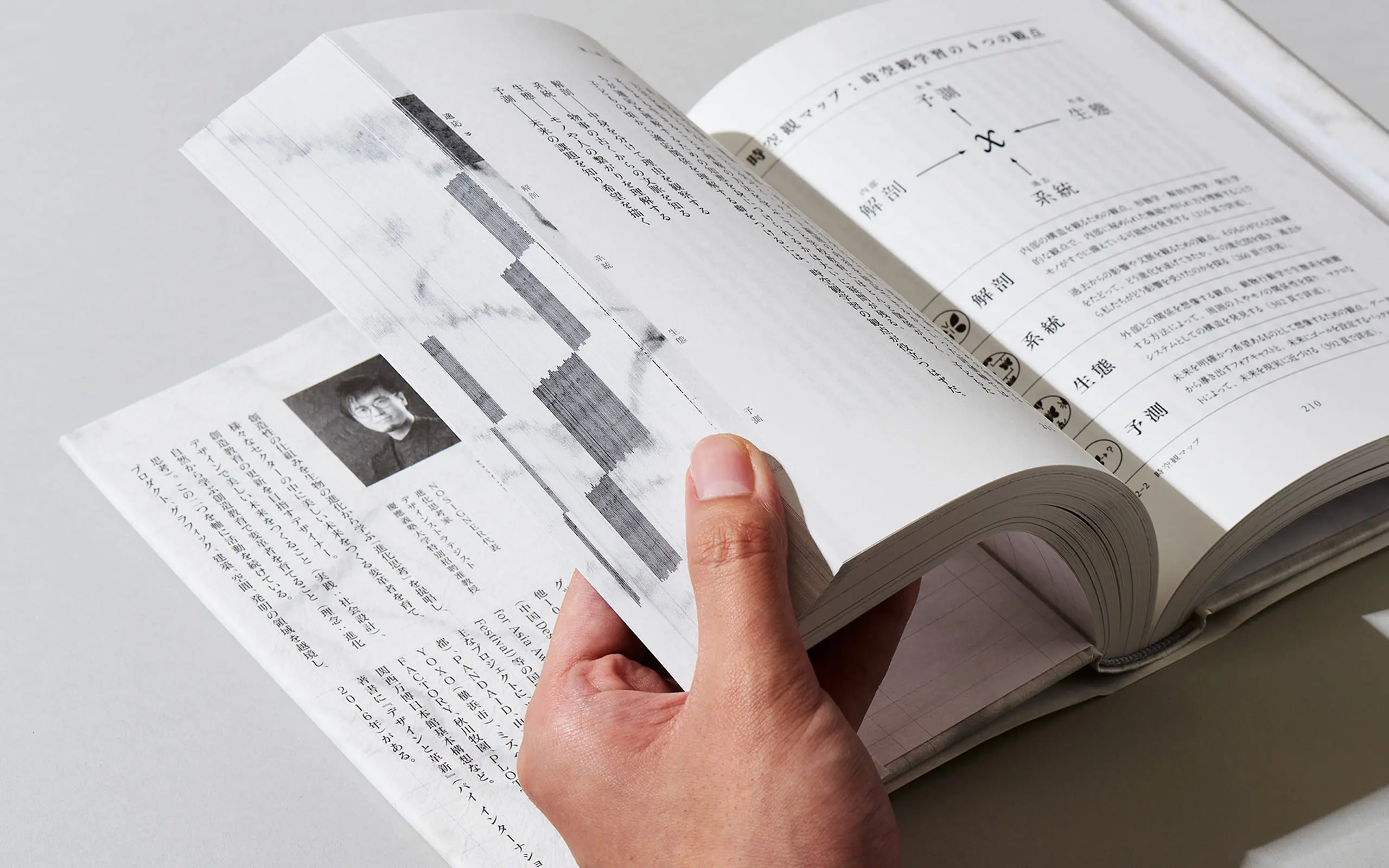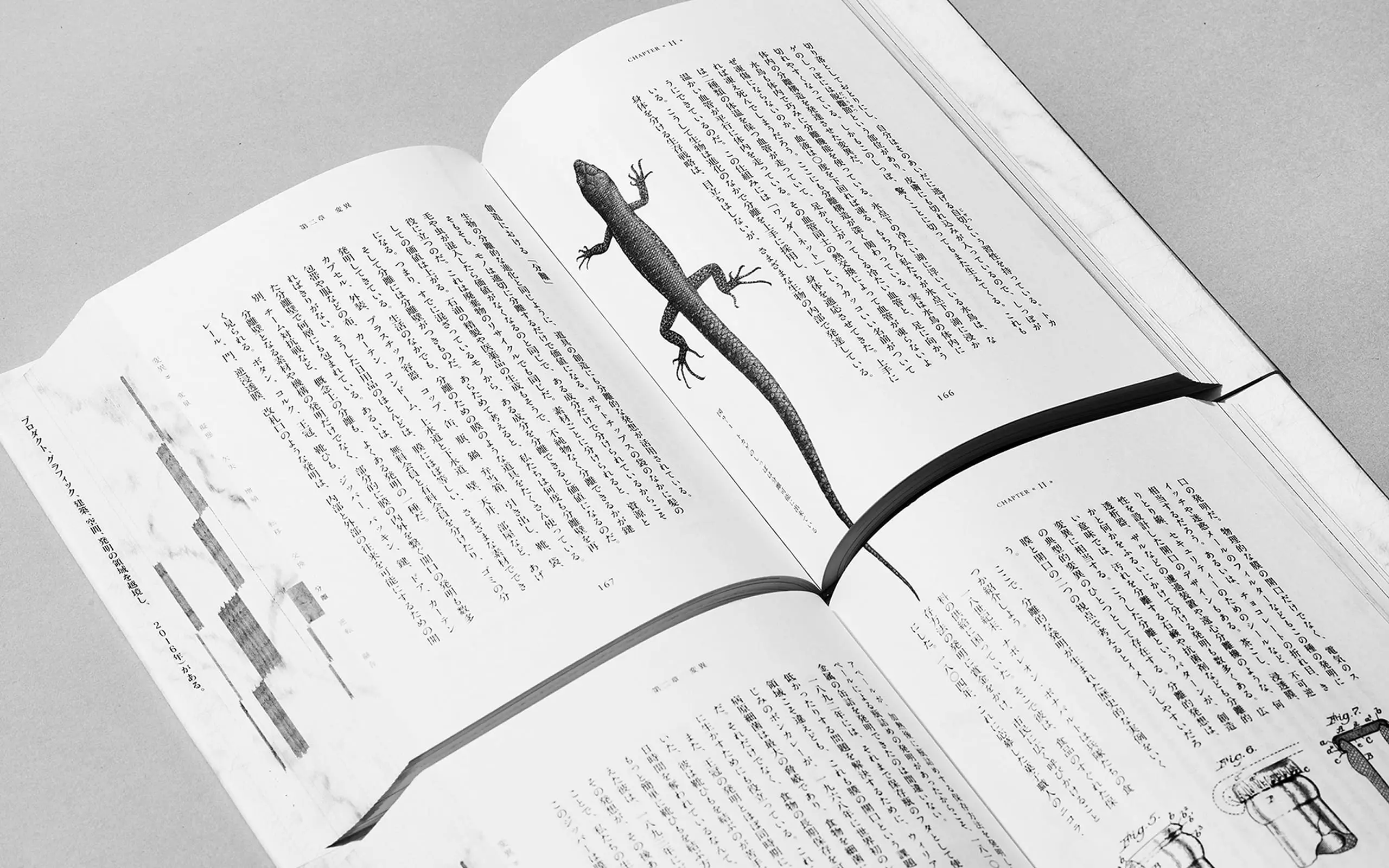 Como Tachikawa es tanto el diseñador del libro como el autor, pudo diseñar efectivamente la composición tipográfica del contenido principal utilizando texto envolvente para integrar las ilustraciones en el texto. El índice del libro también tiene un patrón de mármol para facilitar la búsqueda de temas y la relectura del texto.