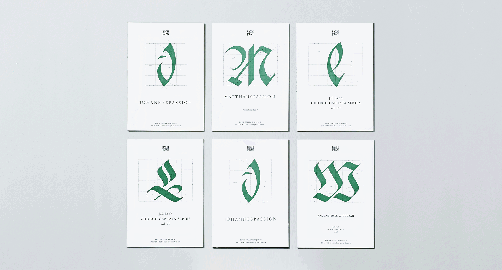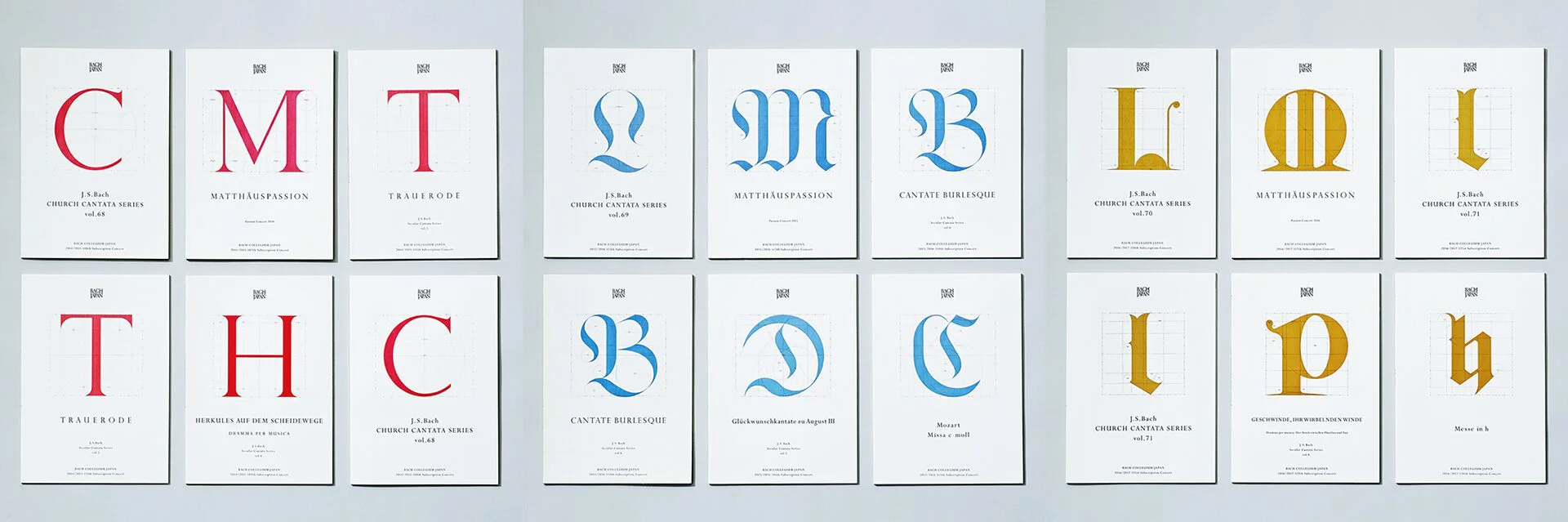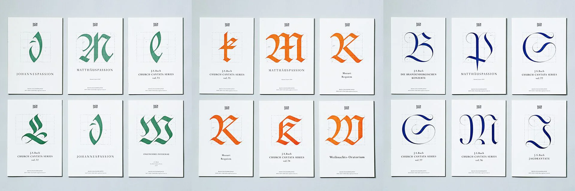 L'aspect recherche du Bach Collegium Japan se concentre sur la musique baroque et les œuvres religieuses de J.S. Bach. Il est d'une grande valeur académique, ainsi que son contenu de représentation qui reproduit le son original en utilisant des instruments anciens. Nous avons donc décidé de mettre à jour le programme avec un design utilisant des collections de typographies historiques qui étaient tenues en haute estime à l'époque de Bach. Chaque année, nous mettions en avant une nouvelle typographie classique, comme l'Onciale et la Fraktur qui étaient utilisées au 18ème siècle en Allemagne, et nous les développions en graphiques qui représentaient les règles et la structure typographiques comme un dessin architectural.