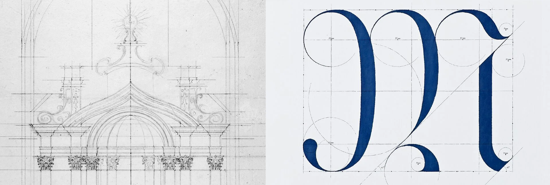 En utilisant un croquis d'un dessin architectural du XVIIIe siècle (à gauche) comme motif, la structure et les règles de conception des polices de caractères classiques sont incorporées visuellement.