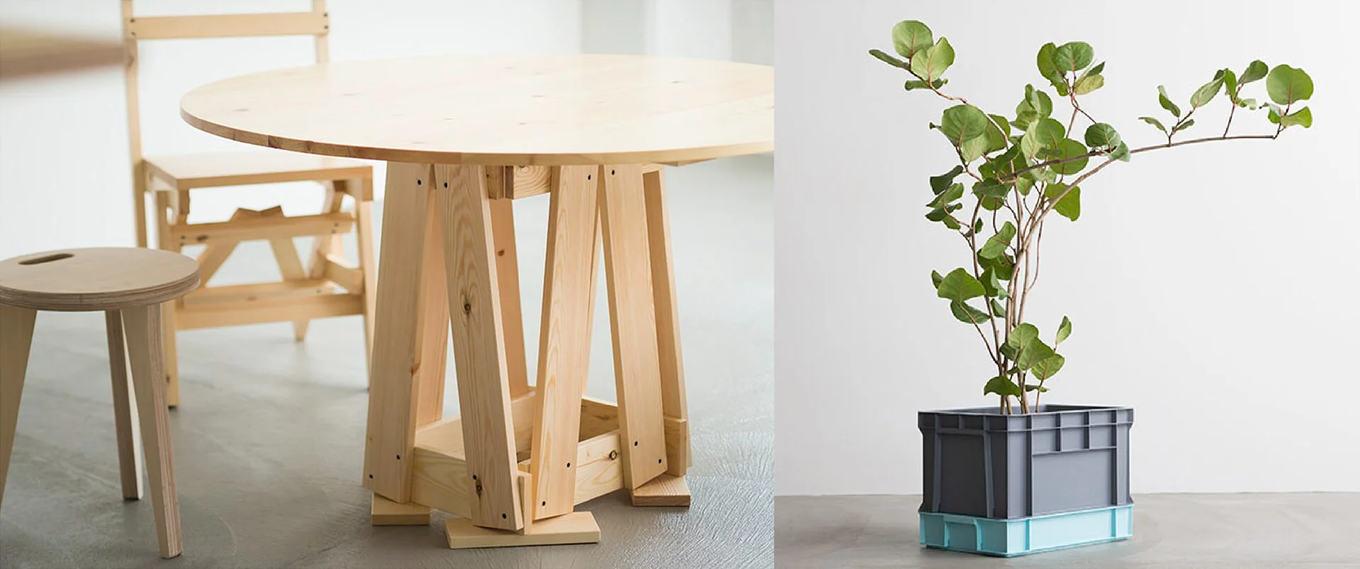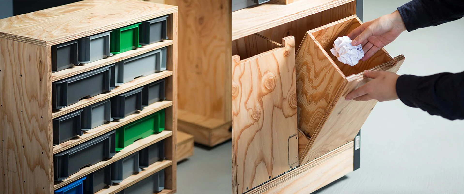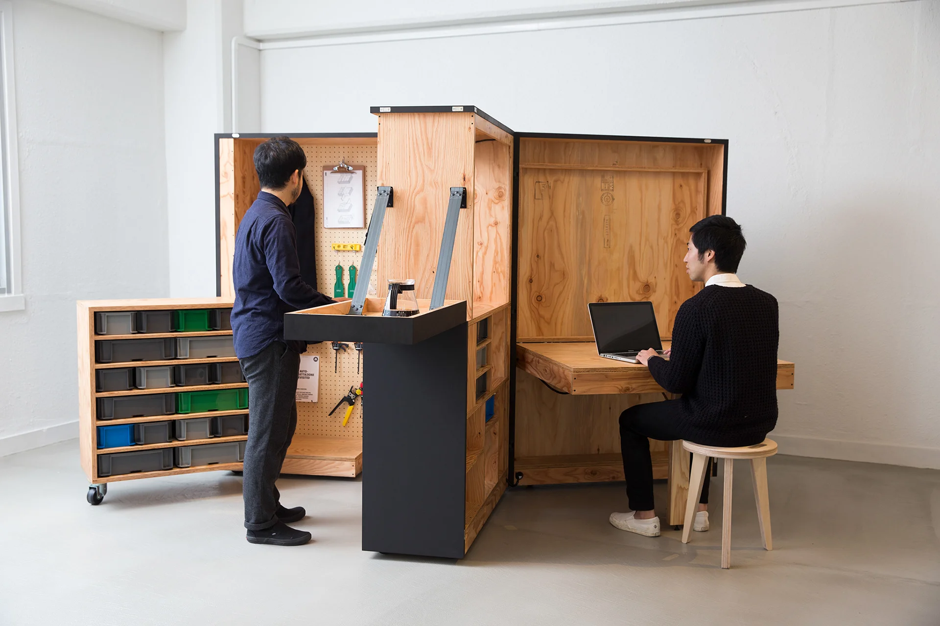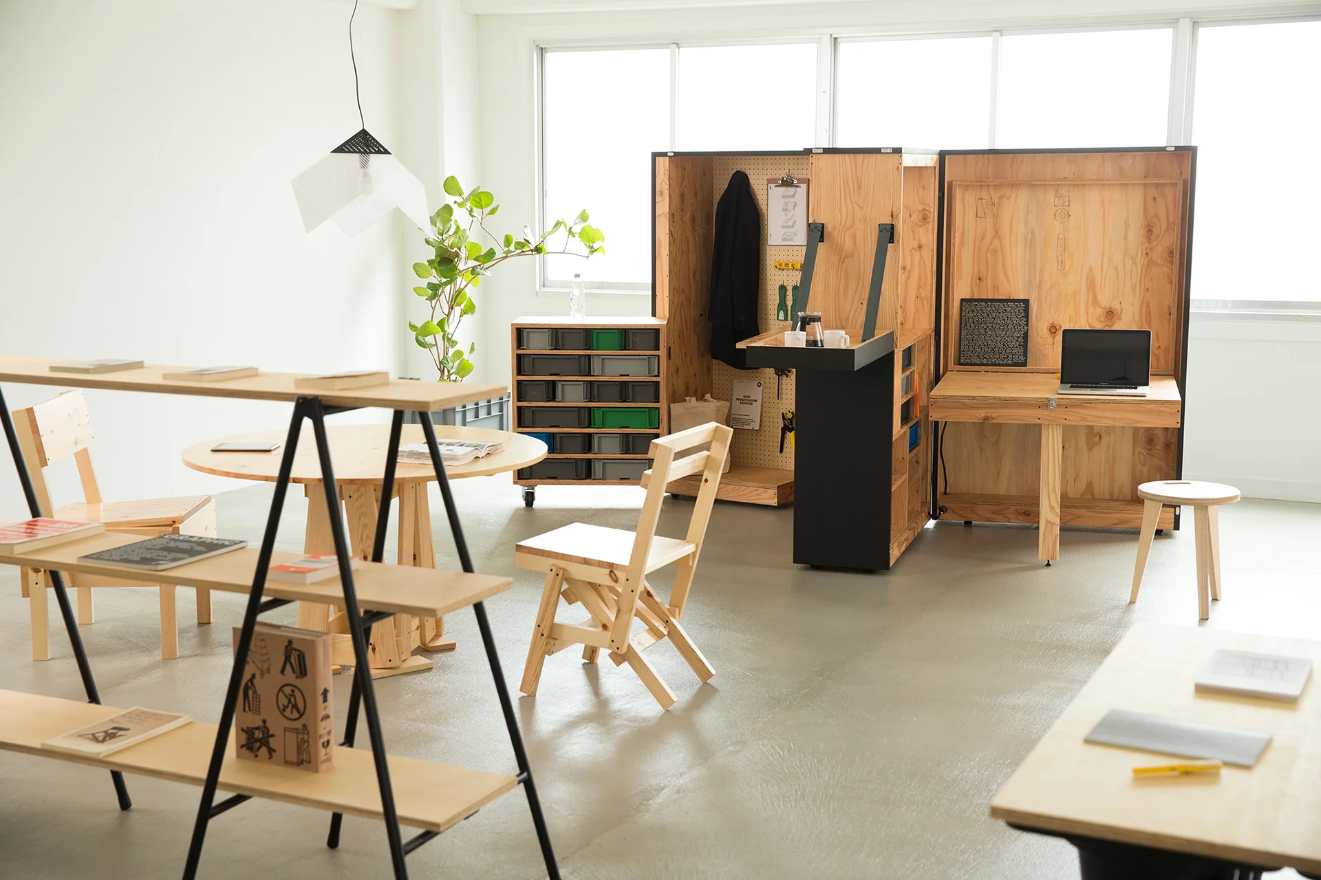 우리는 누구나 만들 수 있는 모바일 작업 공간인 Re-SOHKO TRANSFORM BOX를 디자인했습니다. 닫혀 있을 때는 물건을 쉽게 운반할 수 있는 표준 크기의 팔레트가 됩니다. 물건을 만드는 데 필요한 도구를 보관하고 작업 책상까지 내장되어 있습니다. 어디서든 사용할 수 있는 휴대용 작업장입니다. 이 박스를 만들기 위한 설계도는 OPEN SOHKO DESIGN에서도 제공됩니다.