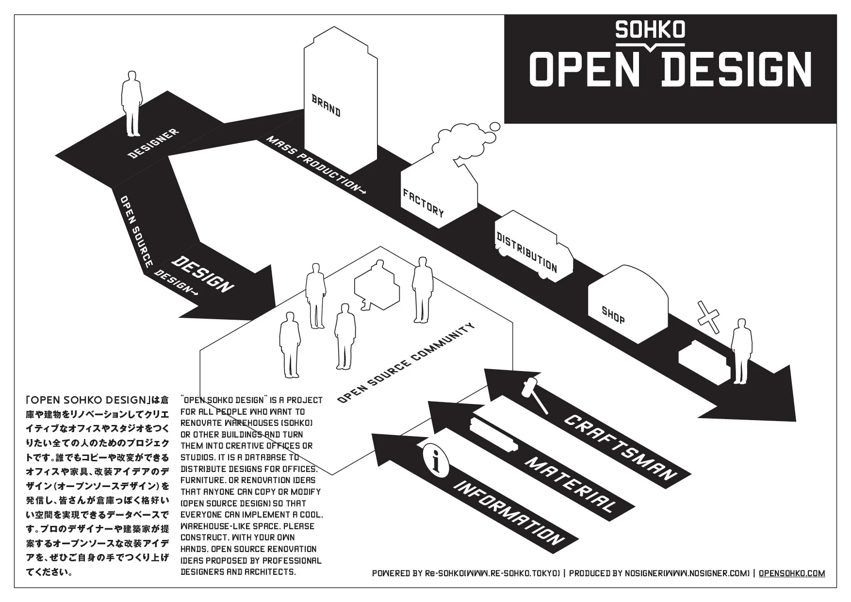 오픈소스 디자인의 대중화와 홍보를 목표로, 요리 레시피와 유사하게 저작권이 없는 디자인을 위한 많은 DIY 레시피 데이터베이스를 갖는 것이 필수적이라고 생각했습니다. Re-SOHKO는 "창고를 사람, 물건, 그리고 사물들과 연결한다"는 개념을 가지고 있습니다. 그들이 창고 개조 요청을 했을 때, 우리는 그들과 함께 OPEN SOHKO DESIGN 웹사이트를 시작하기 위해 협력했습니다.