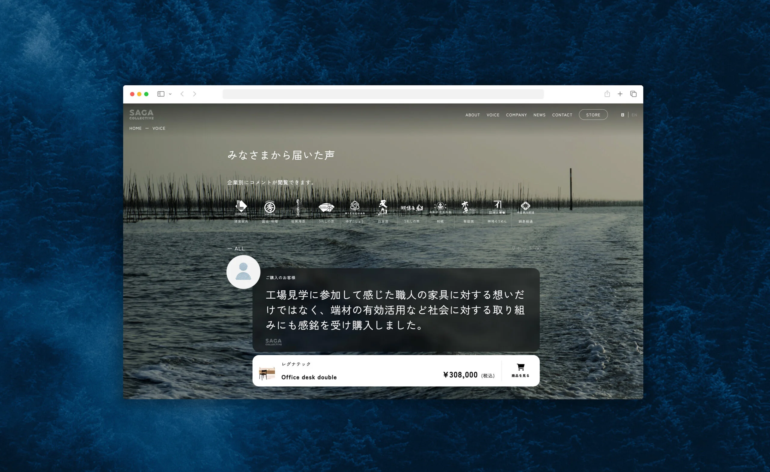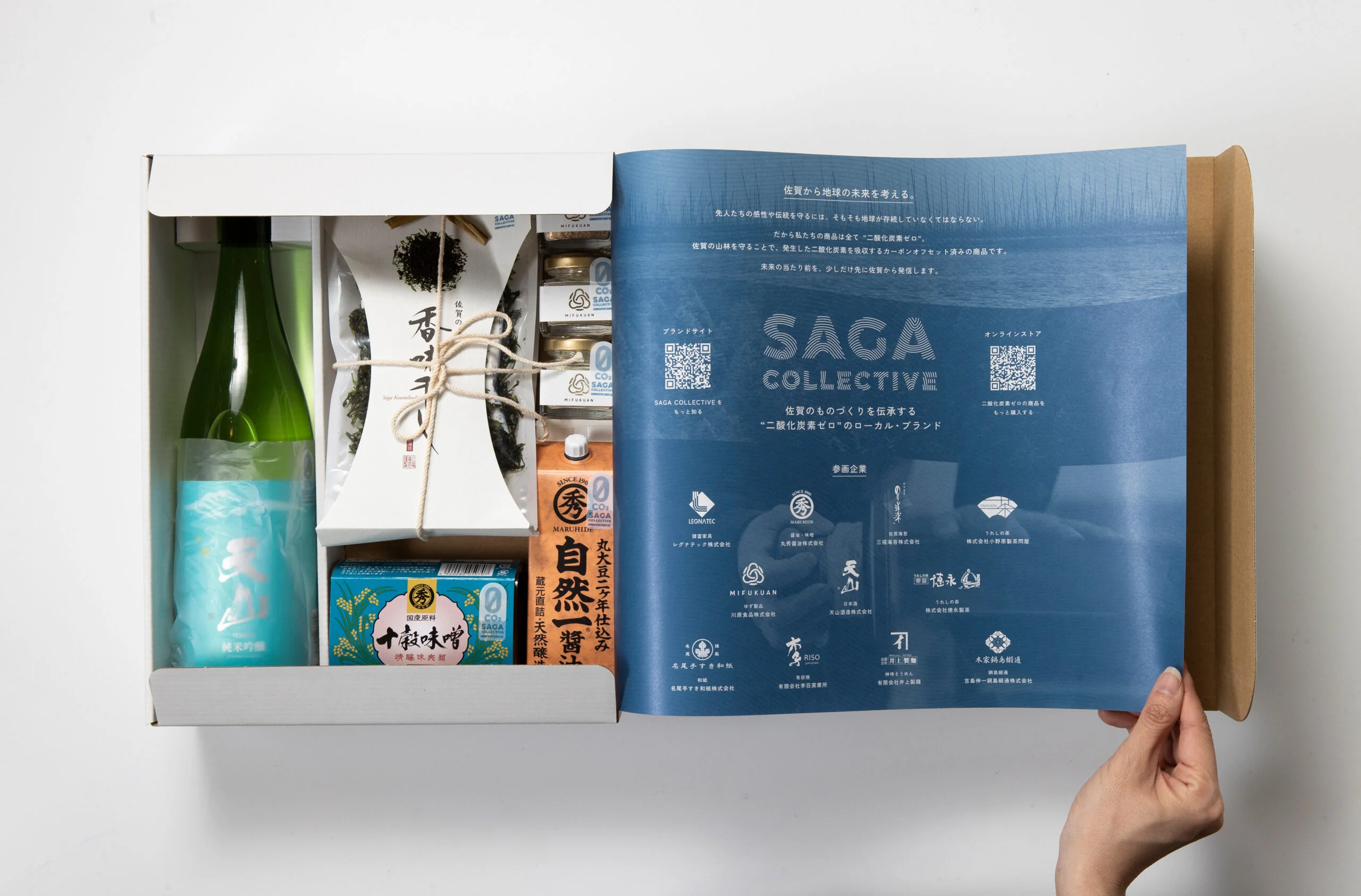 SAGA COLLECTIVE은 사가가 자랑할 수 있는 다양한 제품을 생산하는 지역 기업들의 그룹입니다. 여기에는 해조류, 차, 사케, 아리타 도자기 등이 포함됩니다. 이 모든 제품들은 각각의 제품 카테고리에서 높은 평가를 받고 있습니다. 그러나 지역 브랜드로서의 독특함을 확립하기 위해서는 단순히 유명한 지역 제품들을 모으는 것만으로는 충분하지 않습니다. 따라서 SAGA COLLECTIVE 브랜드 하에, 우리는 일본 최초의 "모든 제품이 탈탄소화된 지역 브랜드"를 제안합니다. 제품의 탄소 배출량은 사가의 숲을 보존하는 데 도움이 되는 탄소 상쇄를 통해 보상될 것입니다.