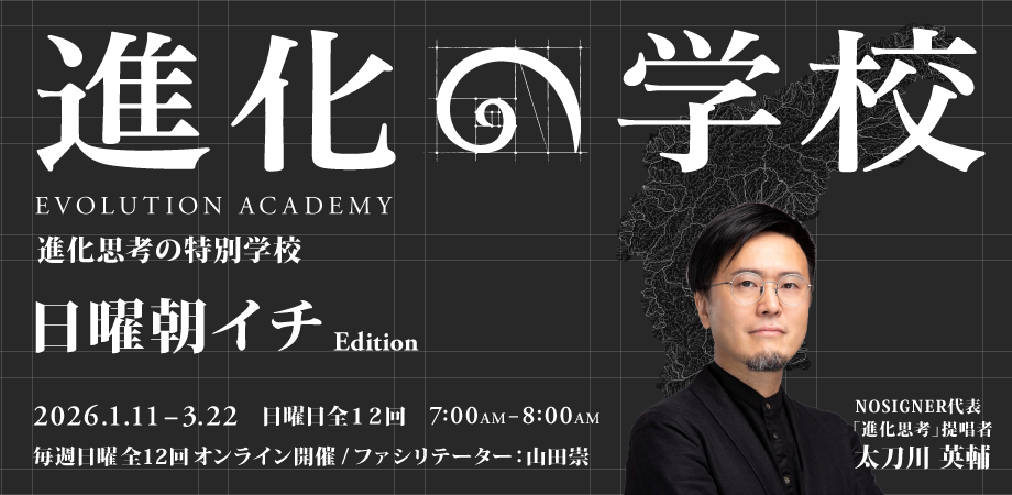 「進化思考」を通じて、組織や個人が未来に適応するための創造性と革新性を育んできたNOSIGNER代表 太刀川英輔が、『進化の学校』の講師として登壇します。