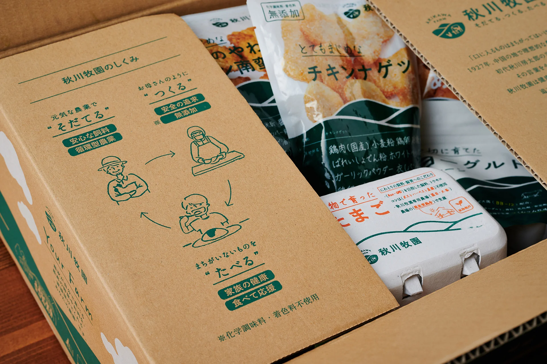 さらに、内フタにはタグラインをよりわかりやすく伝えるためのインフォグラフィックを印刷。ダンボールを開けた瞬間に、秋川牧園の理念がひと目でわかります。