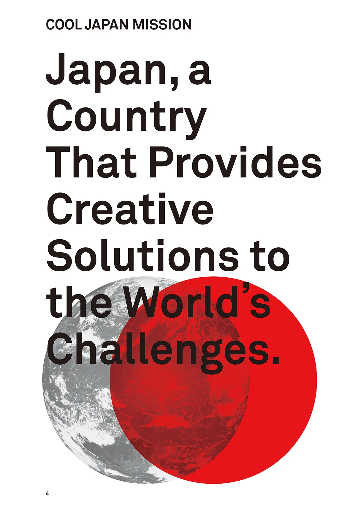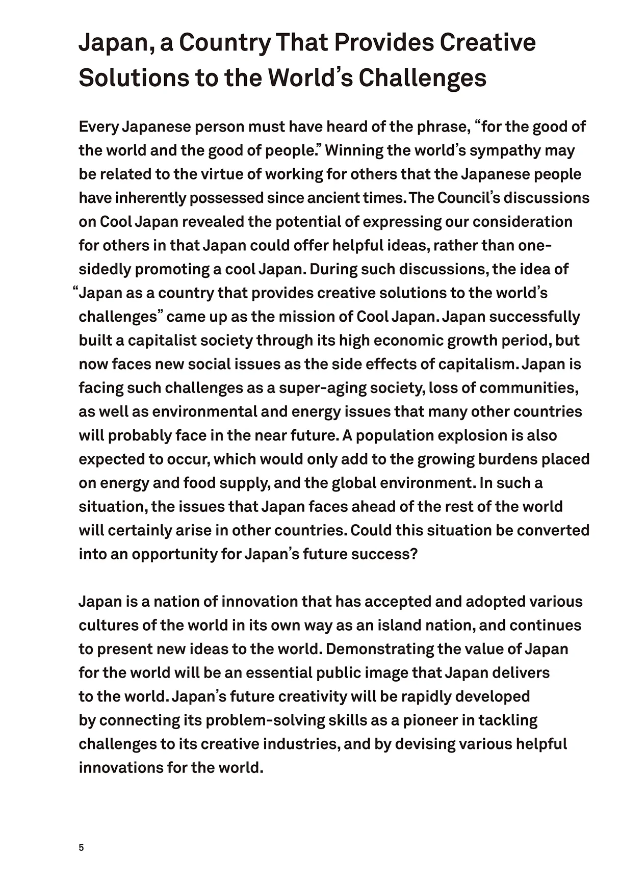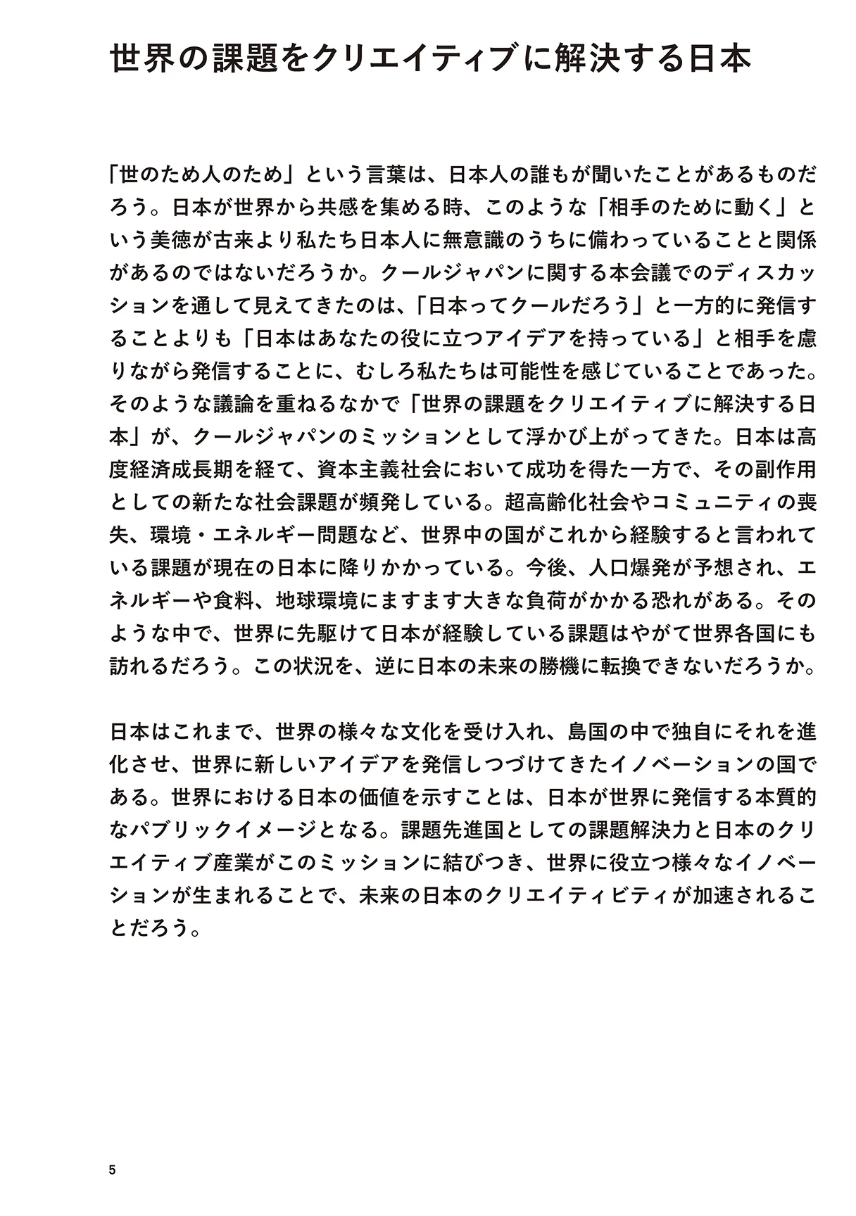 しかし、様々な日本の良さをバラバラと発信するのではピントが甘くなり、メッセージが弱くなってしまうのも事実であり、現状は十分とは言えない。2020年の東京オリンピック・パラリンピック開催が決定し、クールジャパン戦略に対する追い風が吹いているこの好機を逃すことのないよう、CJムーブメント推進会議において更なる発信力強化に向けた議論を重ねてきた。気鋭の若手デザイナーである太刀川英輔氏をコンセプト・ディレクターに迎え、日本のみならず、世界の第一線で活躍する多彩なアーティスト、アスリート、ク リエイターにもゲストとして多数参加いただき、従来の政府のお堅い会議ではあり得ない顔ぶれと自由な雰囲気で大いに議論し、私も楽しみながら意見を言わせてもらった。 議論で見えてきたのは、クールジャパンに期待されることは単に日本文化の紹介や発信を通じた経済効果を期待するものではないということである。日本は少子高齢化、環境・エネルギー問題、財政再建など世界の多くの国々がこれから直面するであろう困難な課題を既に抱え、その解決に取り組んでいる「課題先進国」である。日本は古来より、狭い国土、乏しい資源といった厳しい環境の中で、外国の文物を柔軟に受け入れ、我が国独自の文化として発展させてきた伝統を持つ、イノベーションの国である。今こそ、日本らしい創意工夫で率先して困難な課題を解決していき、世界の先頭に立つ。そして世界の国々が同様の課題に直面した時、日本のやり方を参考にできるようになれば、日本という国のブランド価値をより一層高めていくことにつながる。つまり、「世界の課題をクリエイティブに解決する日本」こそ、新たなクールジャパンのミッションであるとここに宣言したい。