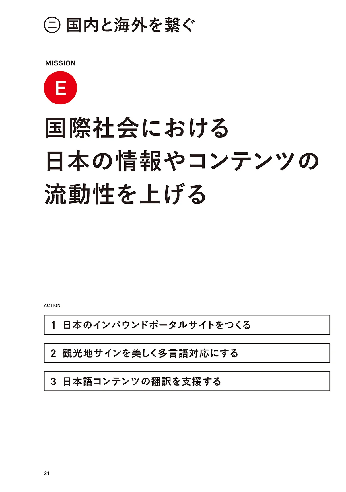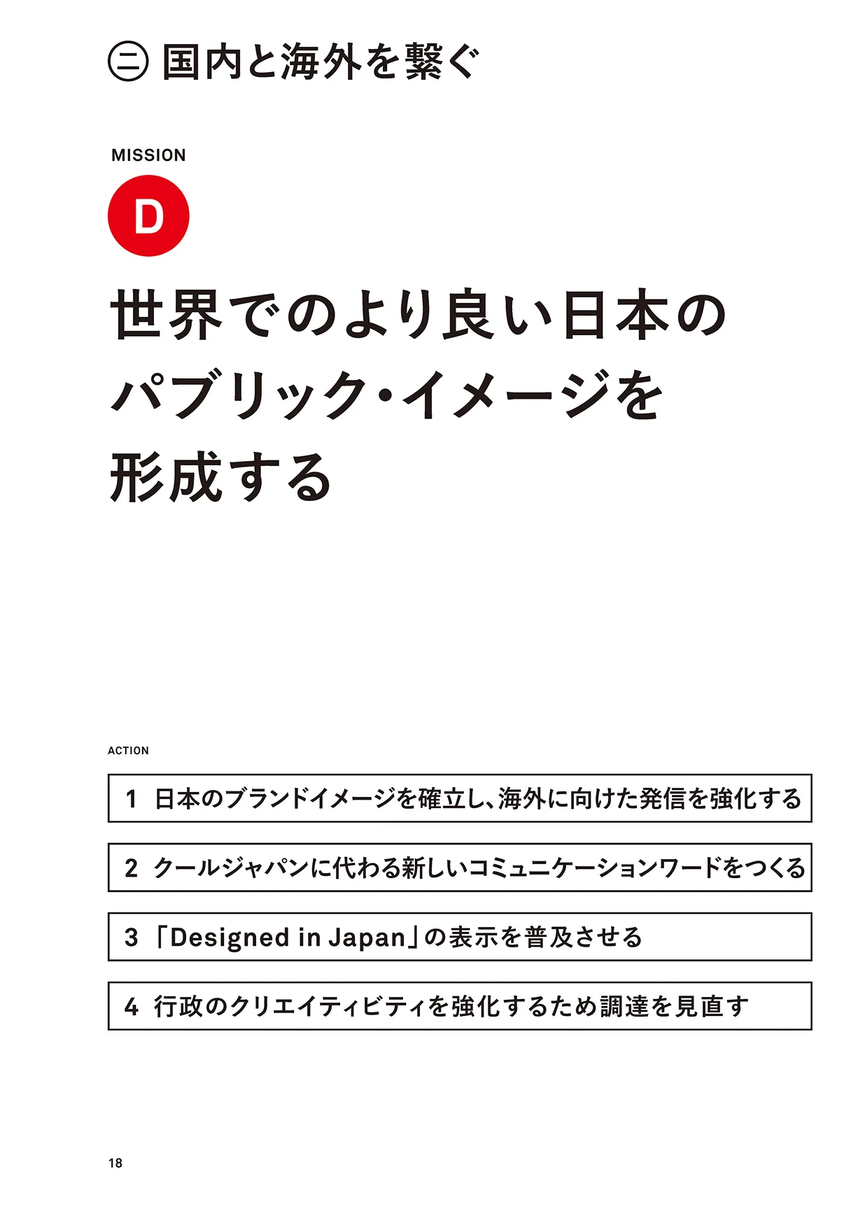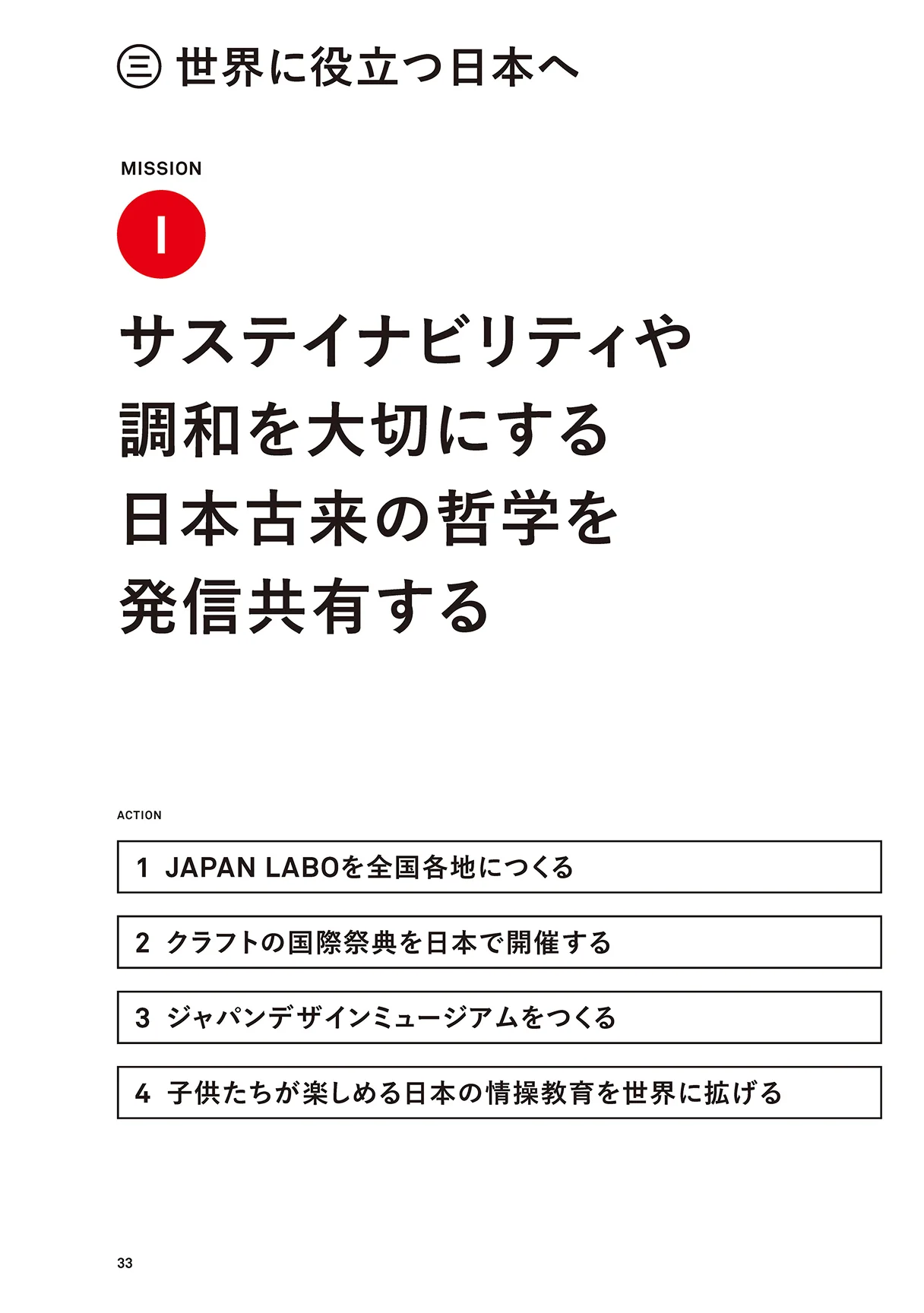 これらを実行に移すために提言書では、「1.国内の成長を促す」「2.国内と海外を繋ぐ」「3.世界に役立つ日本へ」という3つのステップを定義し、さらに各ステップを実行させるための9つのミッション、各ミッションを具体化させるためのアクションをまとめました。