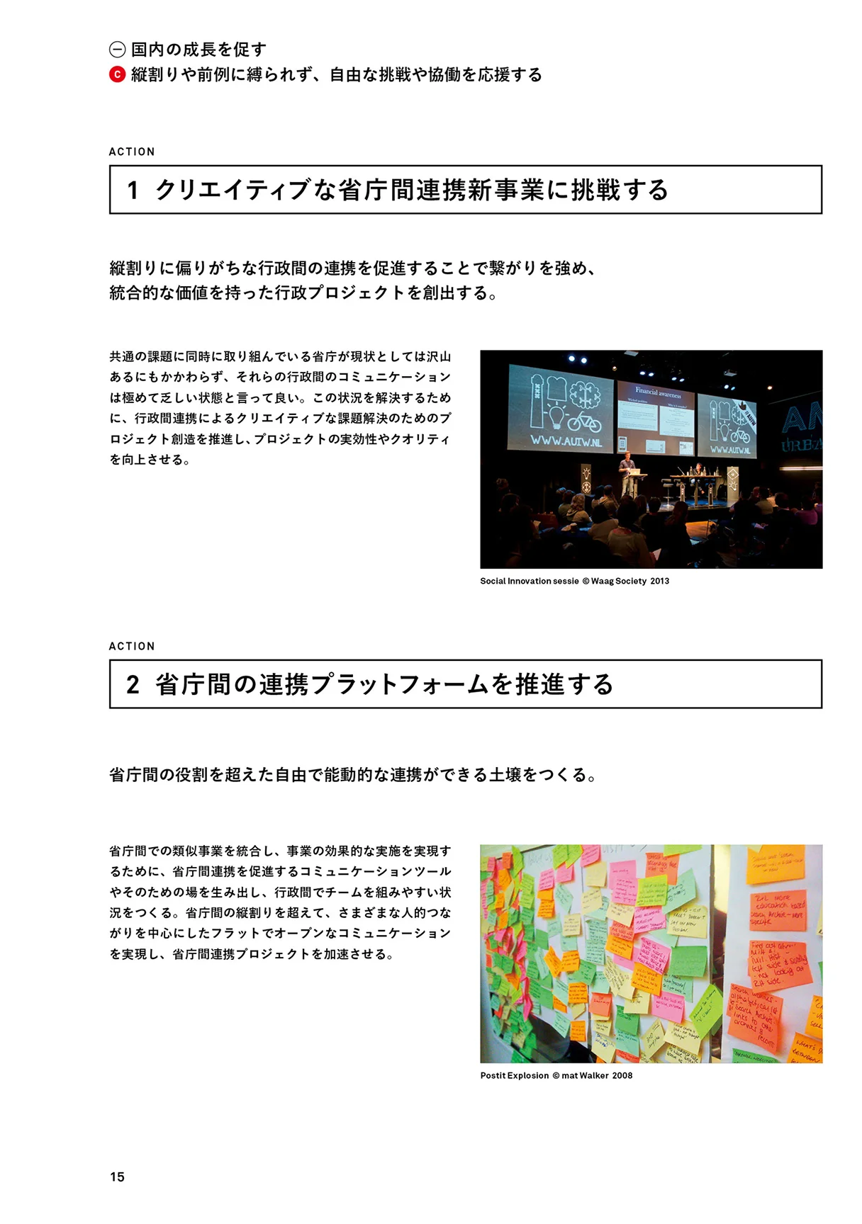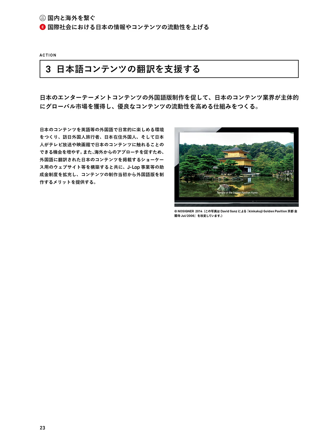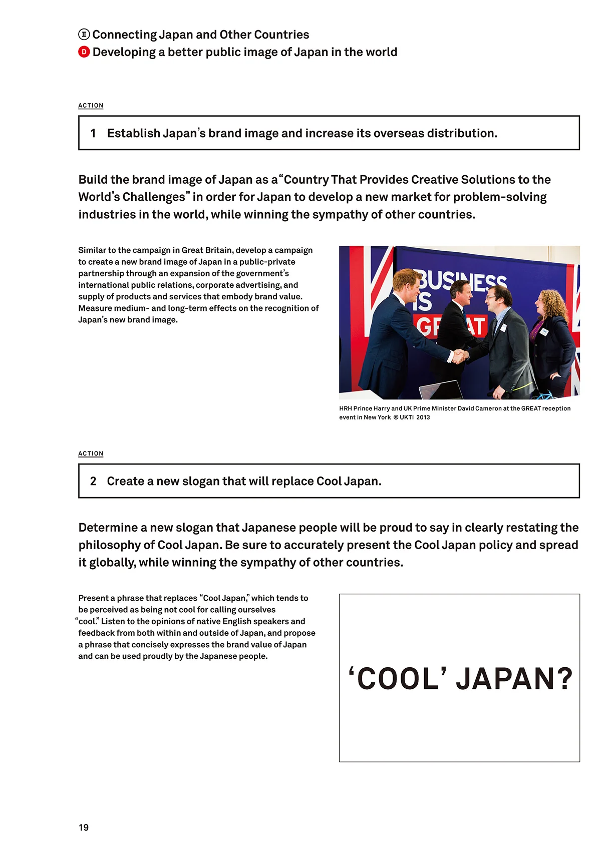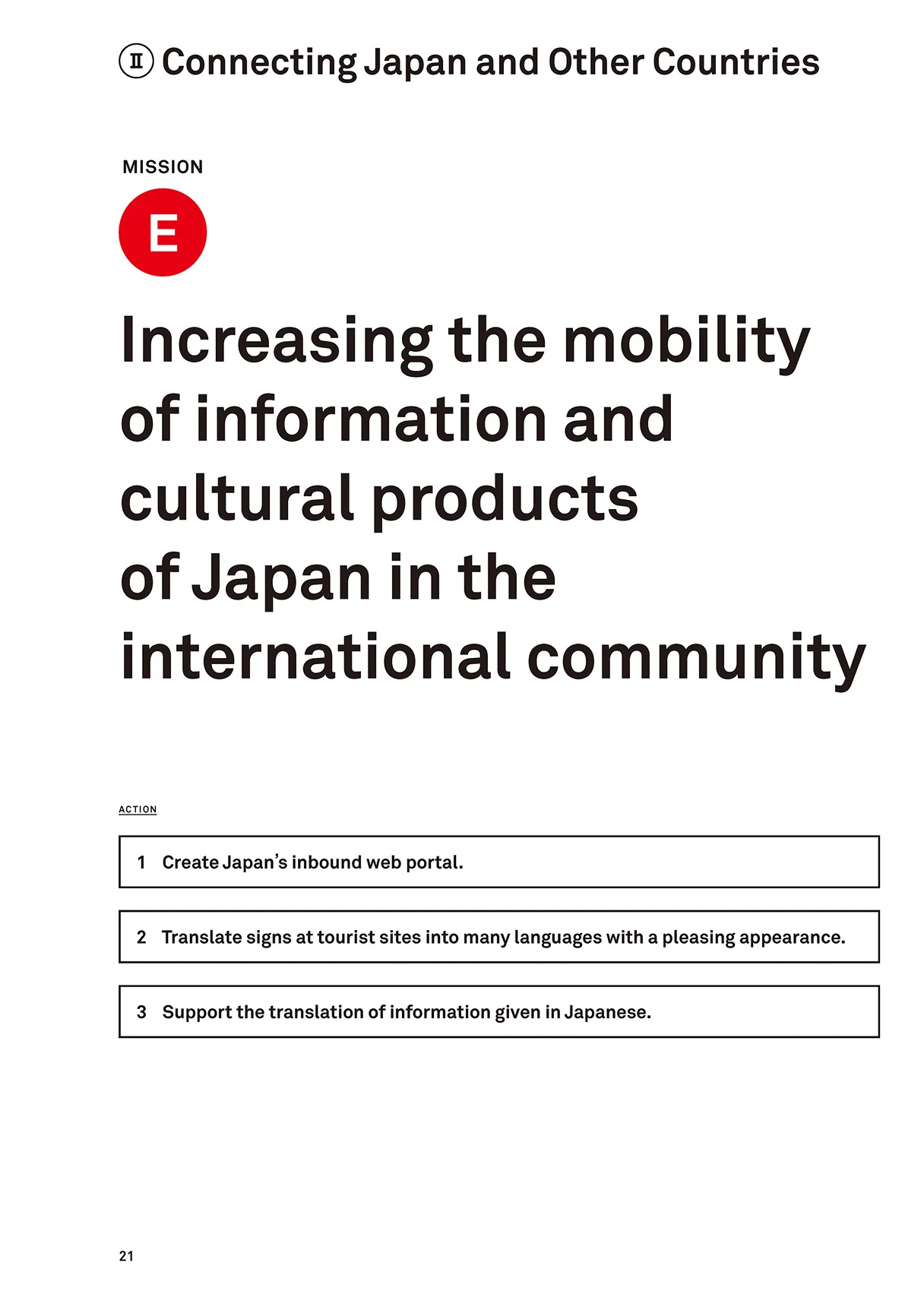これらを実行に移すために提言書では、「1.国内の成長を促す」「2.国内と海外を繋ぐ」「3.世界に役立つ日本へ」という3つのステップを定義し、さらに各ステップを実行させるための9つのミッション、各ミッションを具体化させるためのアクションをまとめました。