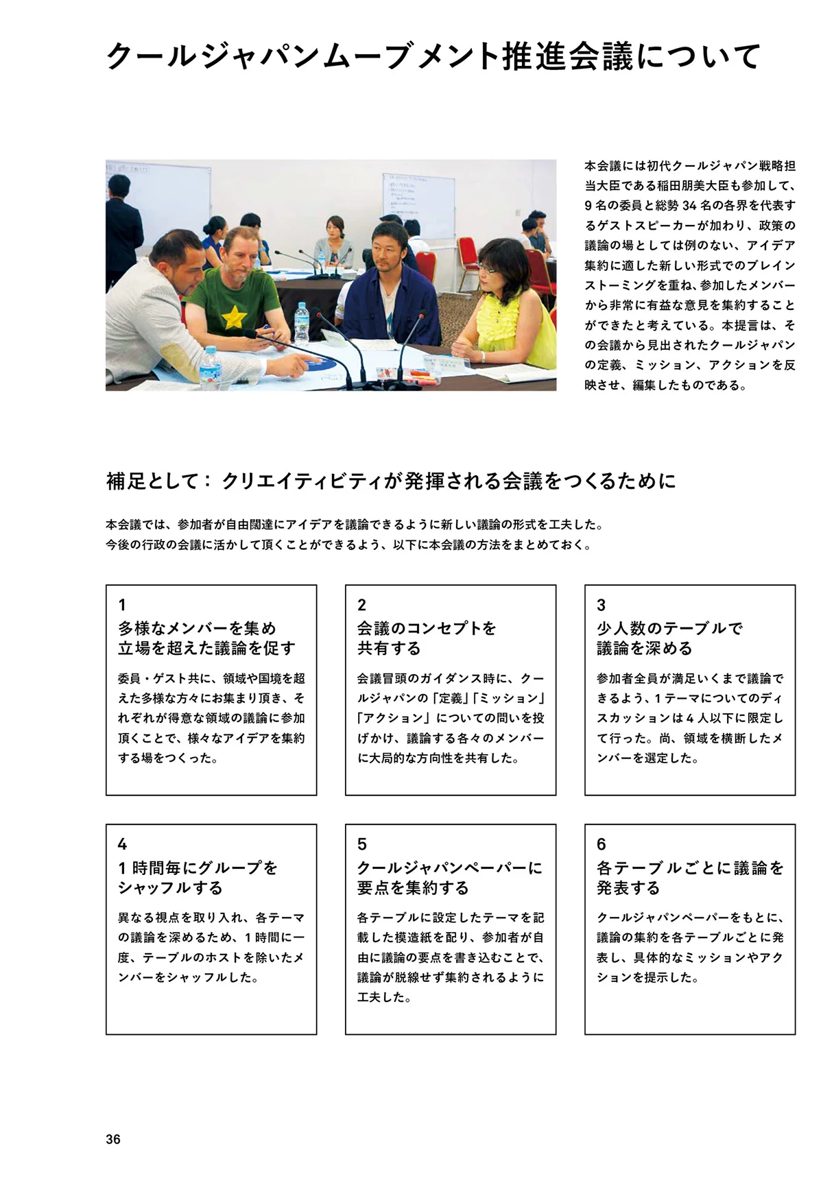 この宣言を踏まえて、会議のコアメンバーを中心に魅力的なアクションをまとめてもらった。政府もこれまで様々な取組を行っているが、これだけ第一線の方々がまとまってクールジャパンの提言を行うことは例のないことである。提言には新事業の創出や、既存事業を加速させるアイディアが詰まっており、是非各省庁にはそれぞれの取組に生かしてもらいたい。また、この会議に参加いただいたメンバーやゲストの方々という人財を築くことができたことも大きな成果である。今後の各省庁の事業の実施にあたり、アドバイスの提供や、イベントヘの協力など、メンバーやゲストの方々には引き続きの御協力をお願いしたい。 クールジャパン戦略は次のステージに入った。「日本」というブランドの価値を高めることに終わりはない。これからも新たなチャレンジをどんどん行っていきたい。
