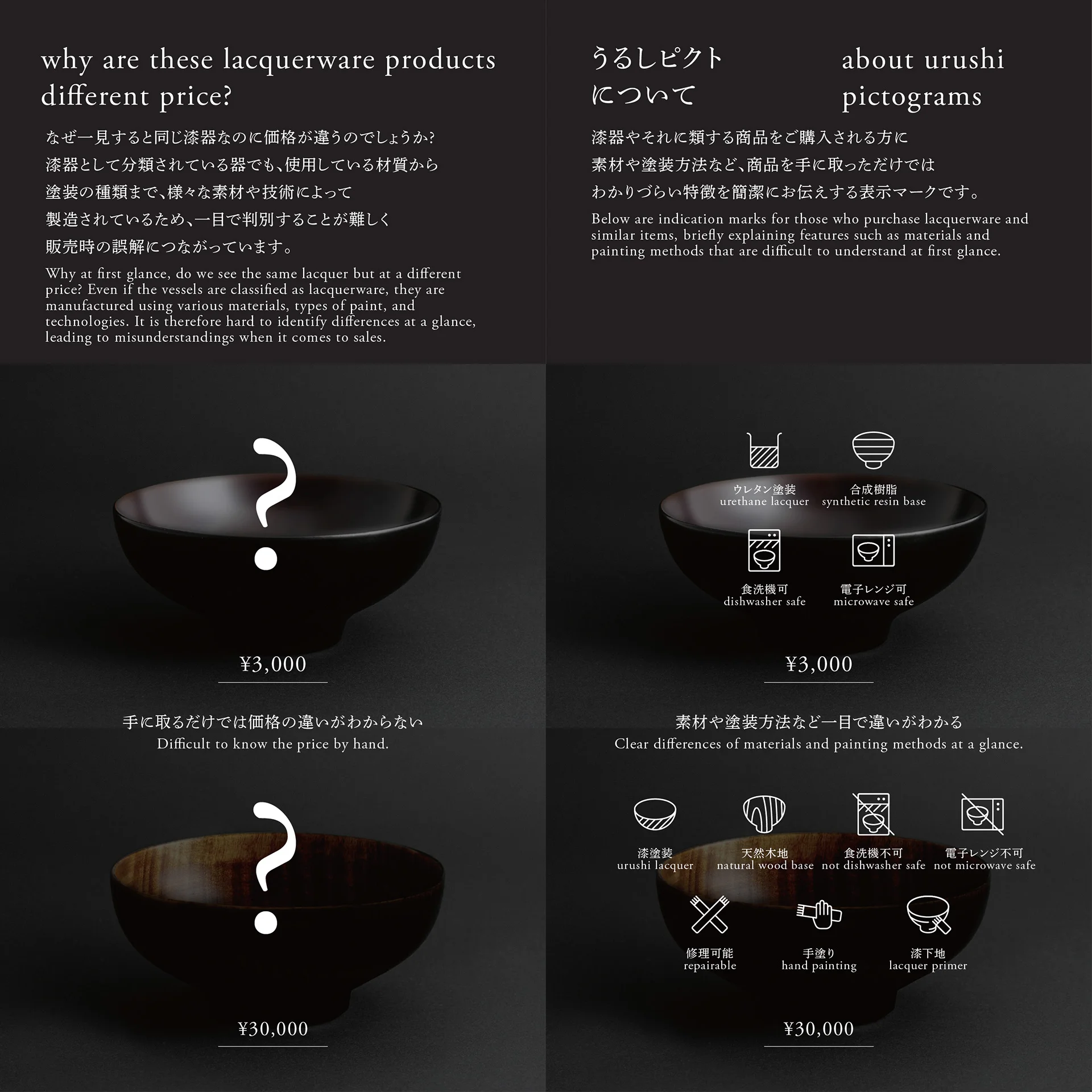 越前漆器のブランディングに携わることになった私たちは、本漆塗りの伝統工芸品と、業務用漆器という2つの異なる顔を持つ産地において、両者のポテンシャルを最大限活かすために、地場産業を「伝統」と「革新」に因数分解することをテーマに据えました。「伝統」軸の取り組みとしては、消費者が安心して本漆の伝統工芸品を買えるように、本漆塗りの製品には認証マークを設定。同時に、これまでメーカーごとに行われていたブランディングを、パッケージの共通化などによって統一することで、アップセルを実現させました。一方、「革新」軸の取り組みとしては、越前漆器ではなく、「越前漆」という名称を打ち出し、合成漆器の生産などを通して磨かれてきた漆塗りの技術を、メガネや携帯電話、車などあらゆるプロダクトに活用し、「塗装」の産地となることで新たな産業を創出することを目指しています。さらに、製品の特性を表すピクトグラムを開発し、プライスタグに表記することによって、それまで判別が難しかった多彩な越前漆器の製法や特性を、消費者がひと目で見分けられるようになりました。