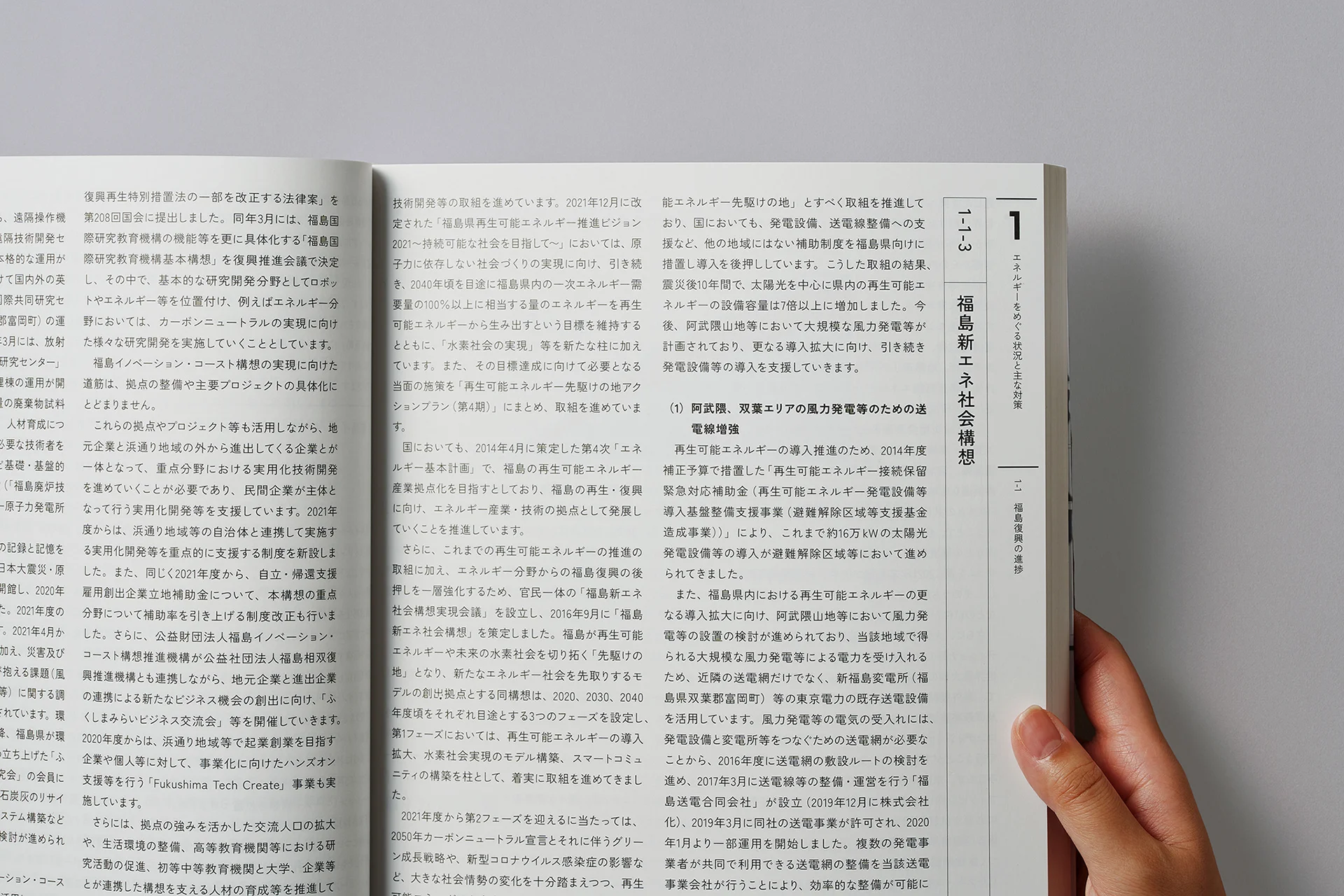 組版ではページタイトルや見出しを目立たせ、部・章・節のタイトルをページの右側に集約させて情報にすぐアクセスできるようにするなど、可読性や検索性を高める工夫を施しています。新しい白書像を提示するヴィジュアルと組版を両立させたデザインによって、日本のエネルギー政策をより開かれたものとして捉えていただくとともに、行政の未来への姿勢や持続可能性への意思を伝えることを目指しました。