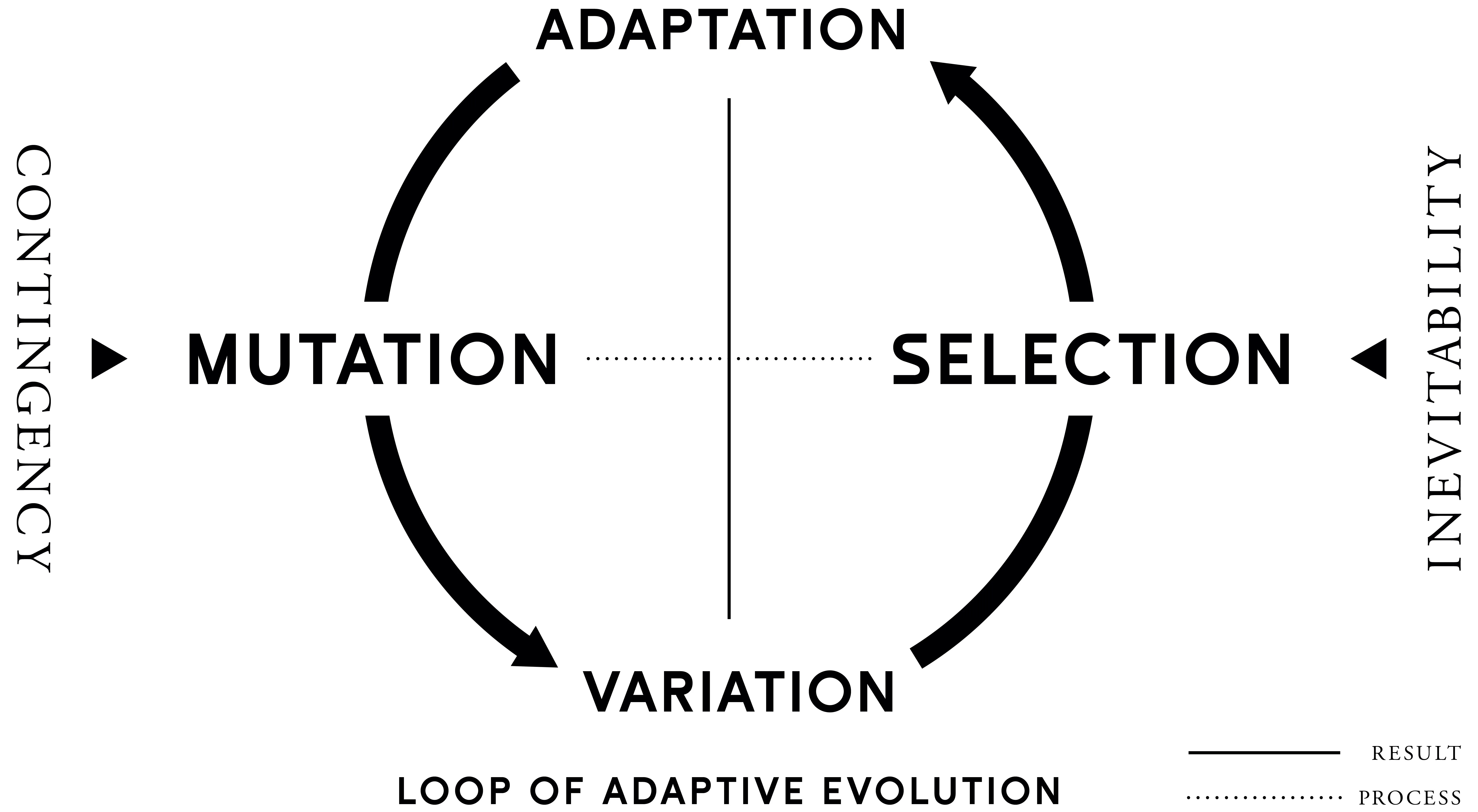(書籍『進化思考』の第一版では偶然の変異と自然選択で近づく適応を指して「変異と適応」の往復と表現していましたが、改訂版以降は学術的な正確性を高めるために「変異と選択」の往復という表現に改めています)