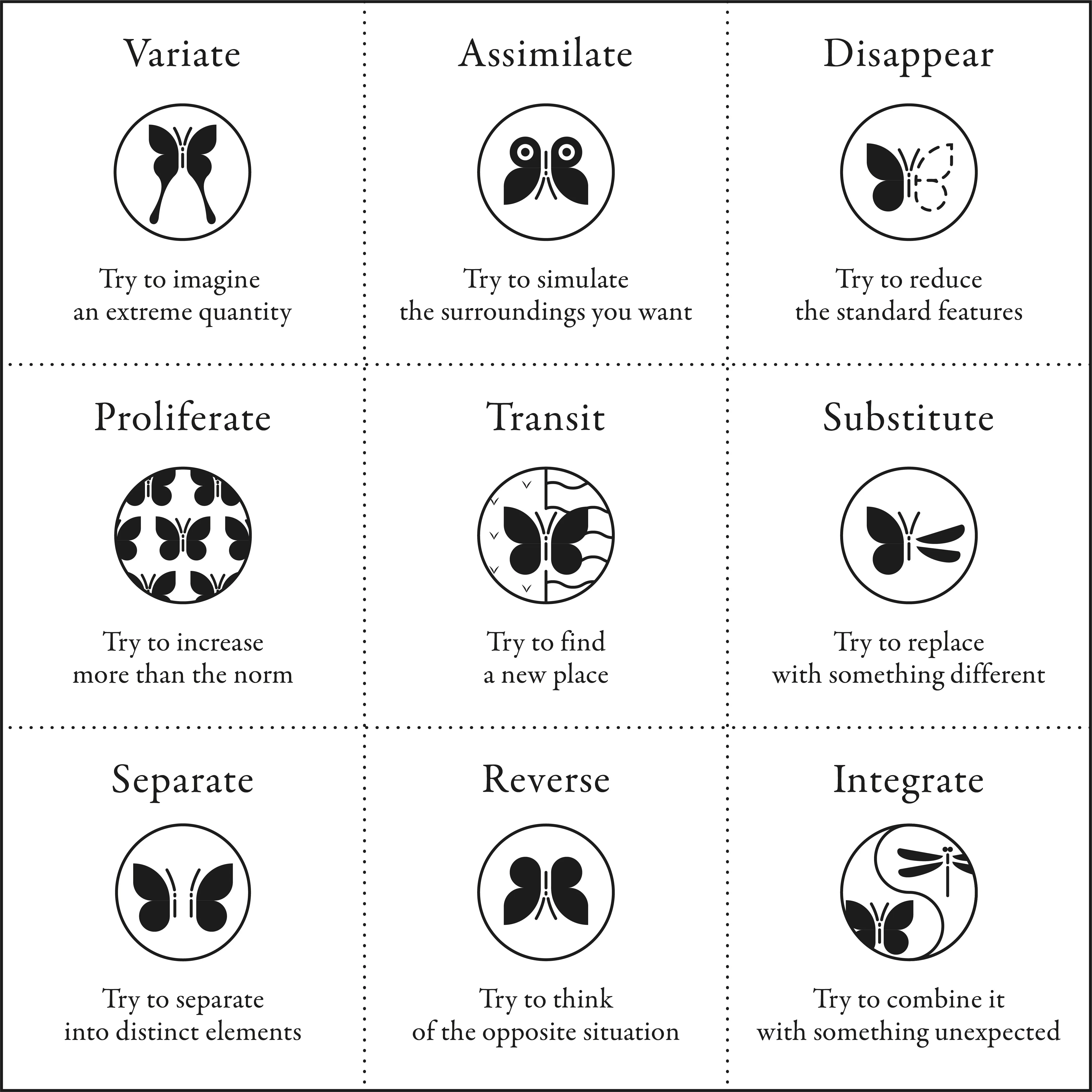 「変量」「消失」「融合」「逆転」「分離」「交換」「擬態」「移動」「増殖」という9つの変異のパターンをツールボックスのように活用していくことで偶然のエラーを大量発生させ、多くのアイデアを短時間で効率的に生み出す。これが変異的思考です。