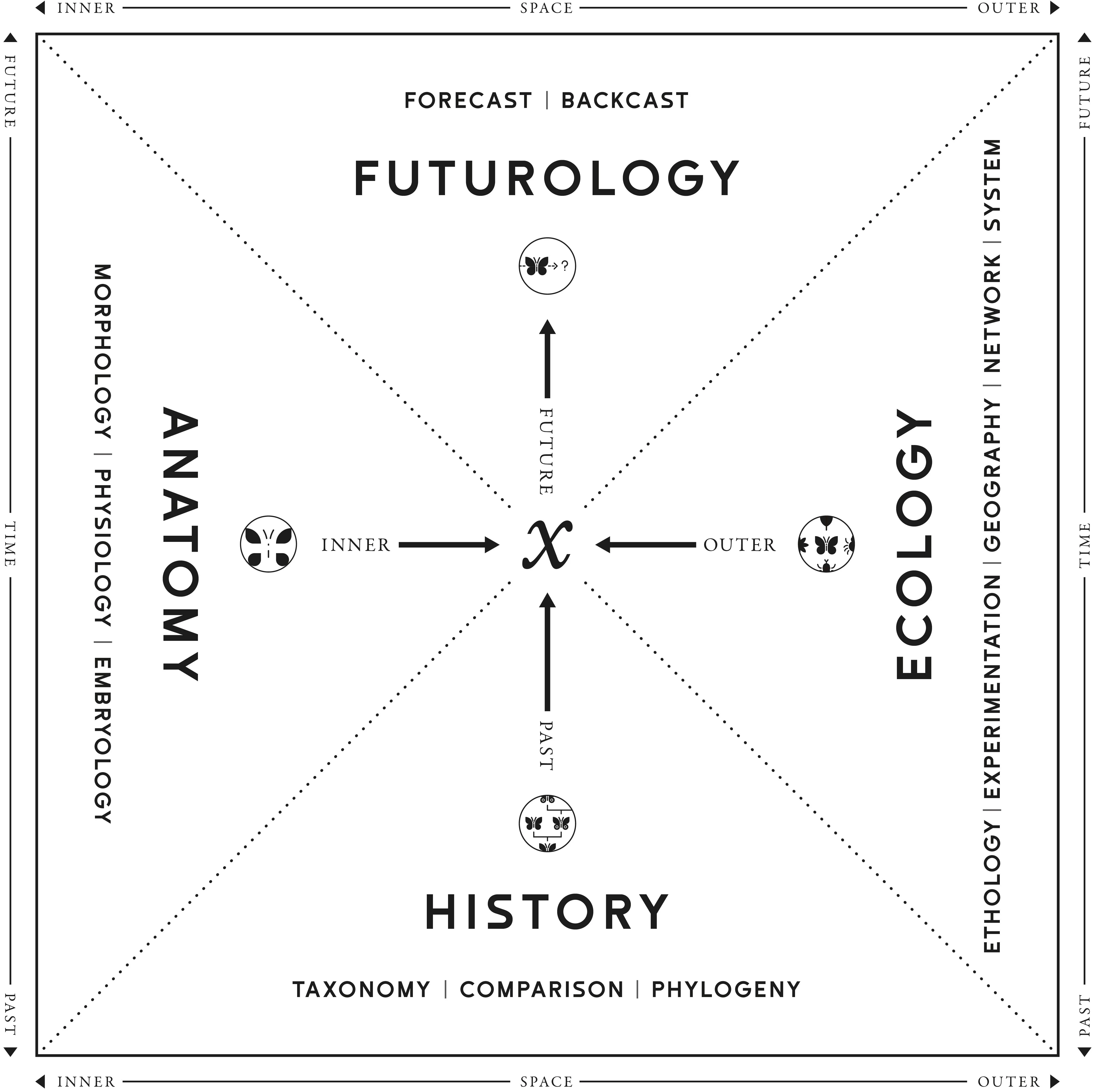 太刀川は様々な自然科学の観察手法を考察する中で、観察には「時間」と「空間」にまたがる4つの観点しかなく、それぞれが生物学的な観察の体系として確立されてきたことに気づきます。そして、内部の構成要素を把握する「解剖」、外部の環境を理解する「生態」、過去にさかのぼって進化の系譜を読み解く「系統」、FORECAST型、BACKCAST型の2つのアプローチから未来を考察する「予測」という4つの「適応」の手法を体系化し「時空観学習」と名付けました。時間と空間にまたがる4つの観点から状況を分析することで、社会の必然的な選択圧を理解し、これらに対応し得る強度のあるアイデアを選択できるようになります。