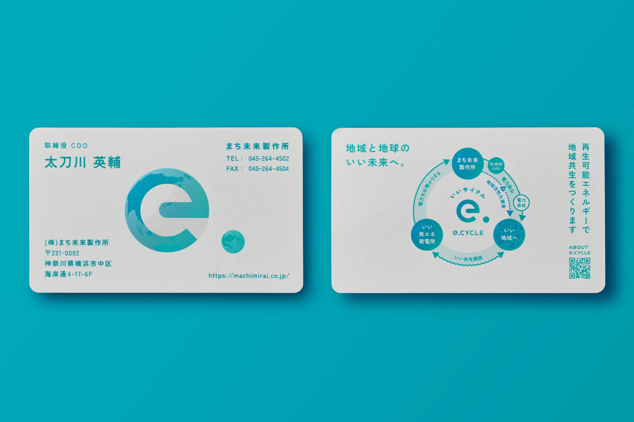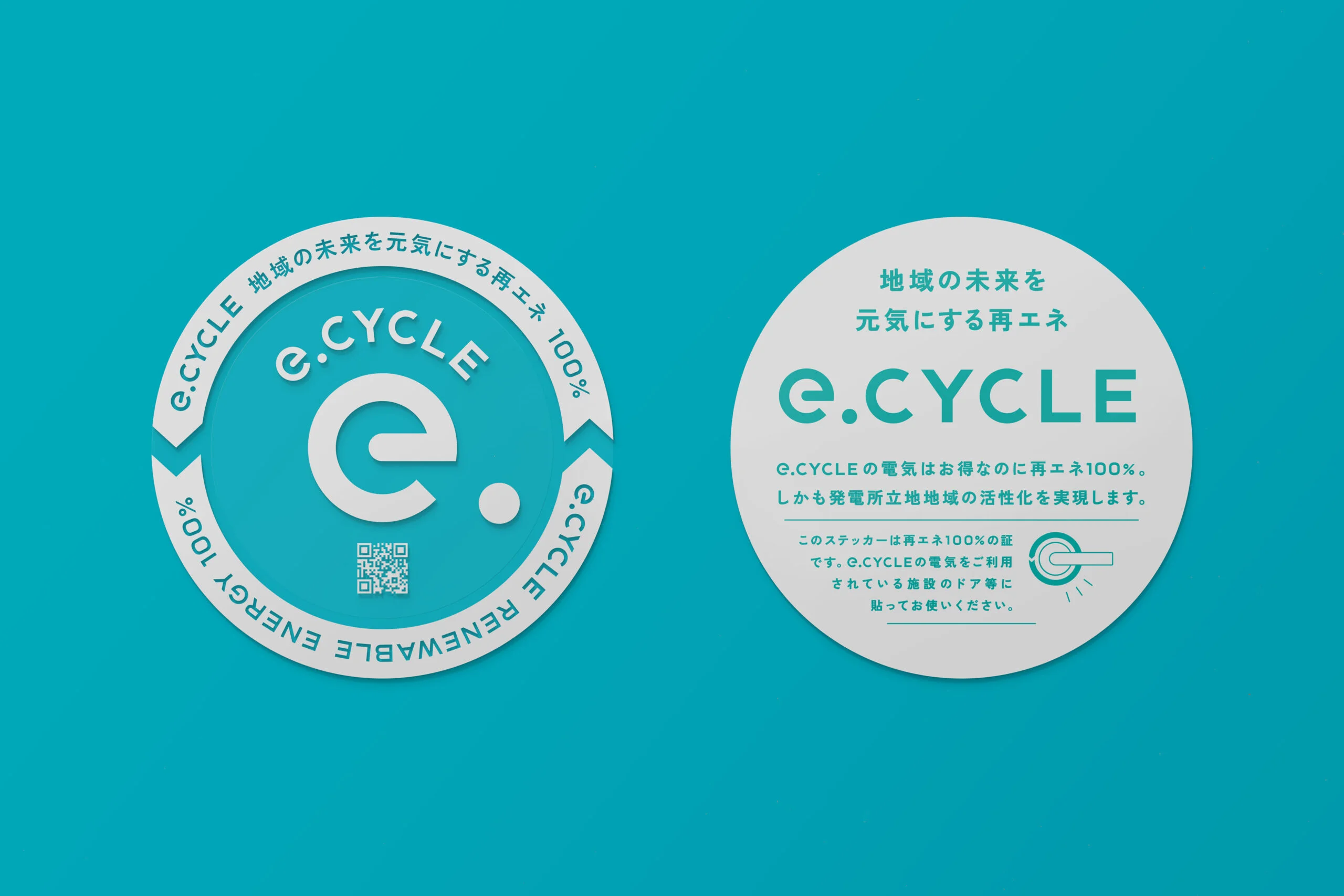 「e.CYCLE」の「e.」は、地球(EARTH)とエネルギー(ENERGY)の頭文字でもあり、地域も地球も持続可能なエネルギーの循環によって、いい未来をつくるという思いが込められています。「e.」と地球の関係を示すために、ロゴデザインでは「e」と「.」の大きさを地球と月のサイズ比に合わせています。