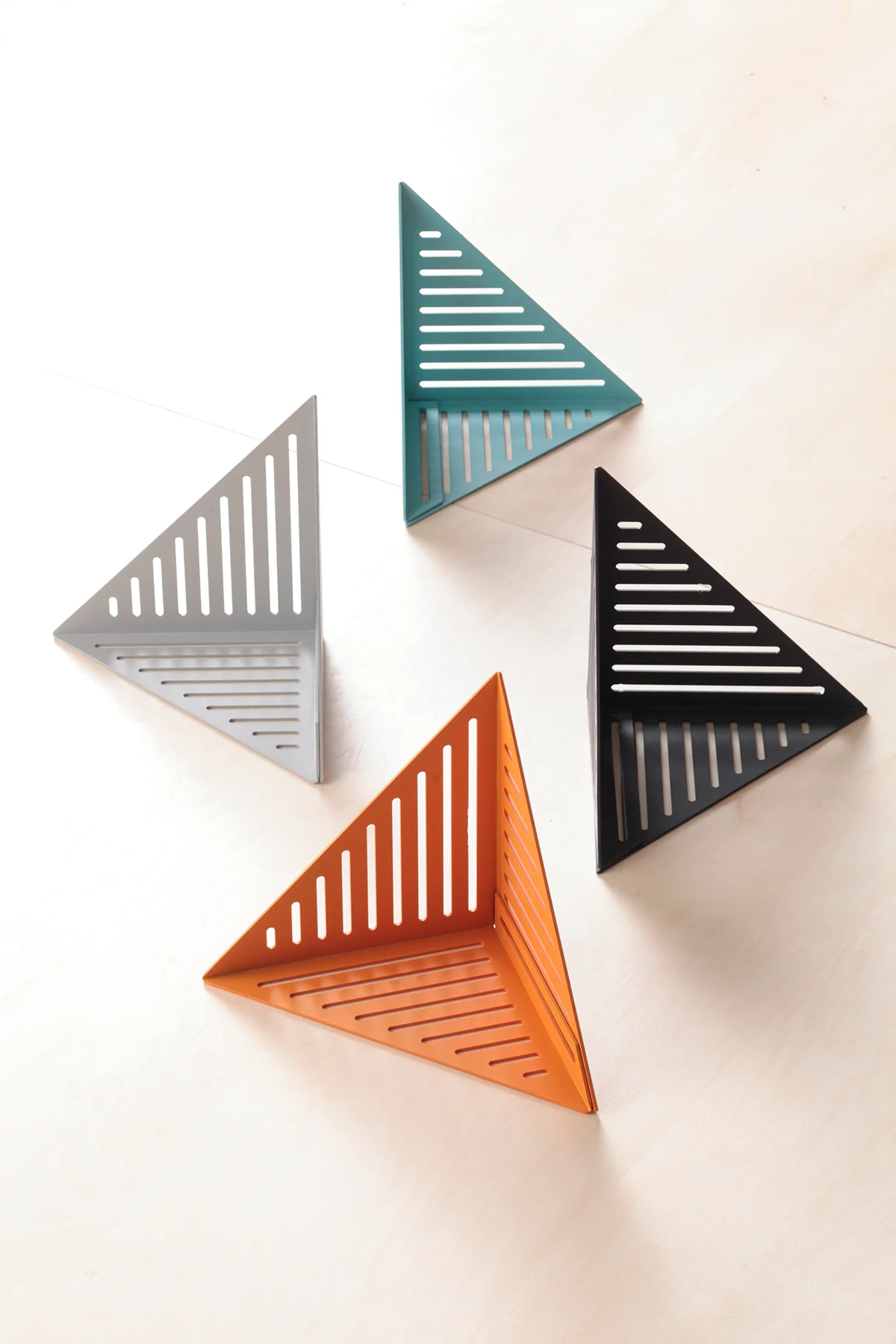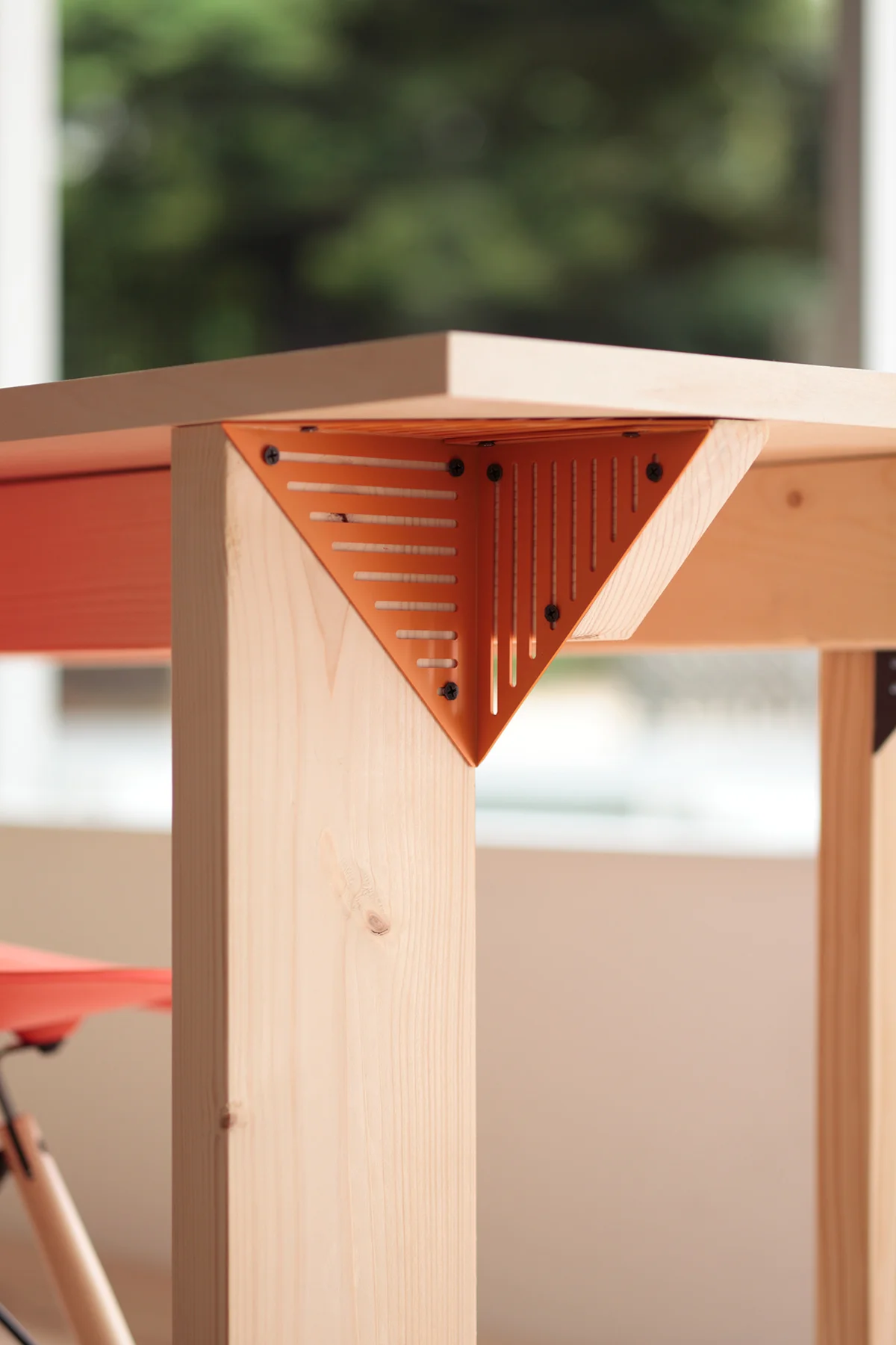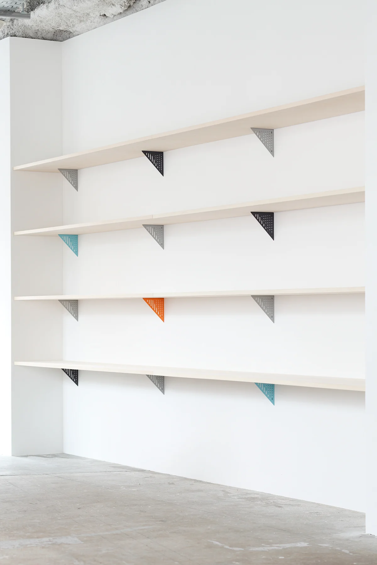 コーナーモジュールは一枚の鋼板からできており、図面を利用してつくることができます。これらのモジュールが机、照明、棚などの空間要素を構成しています。