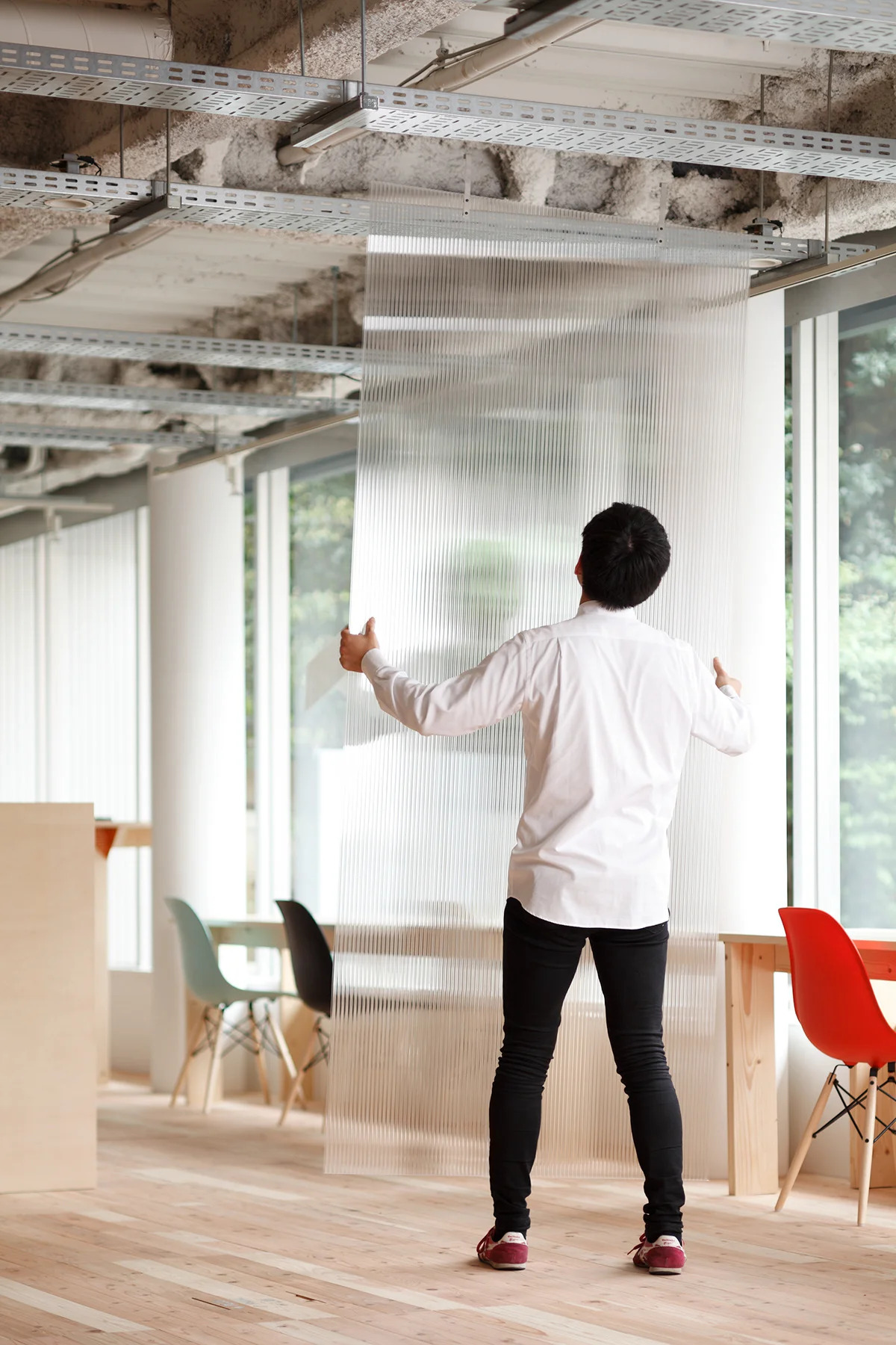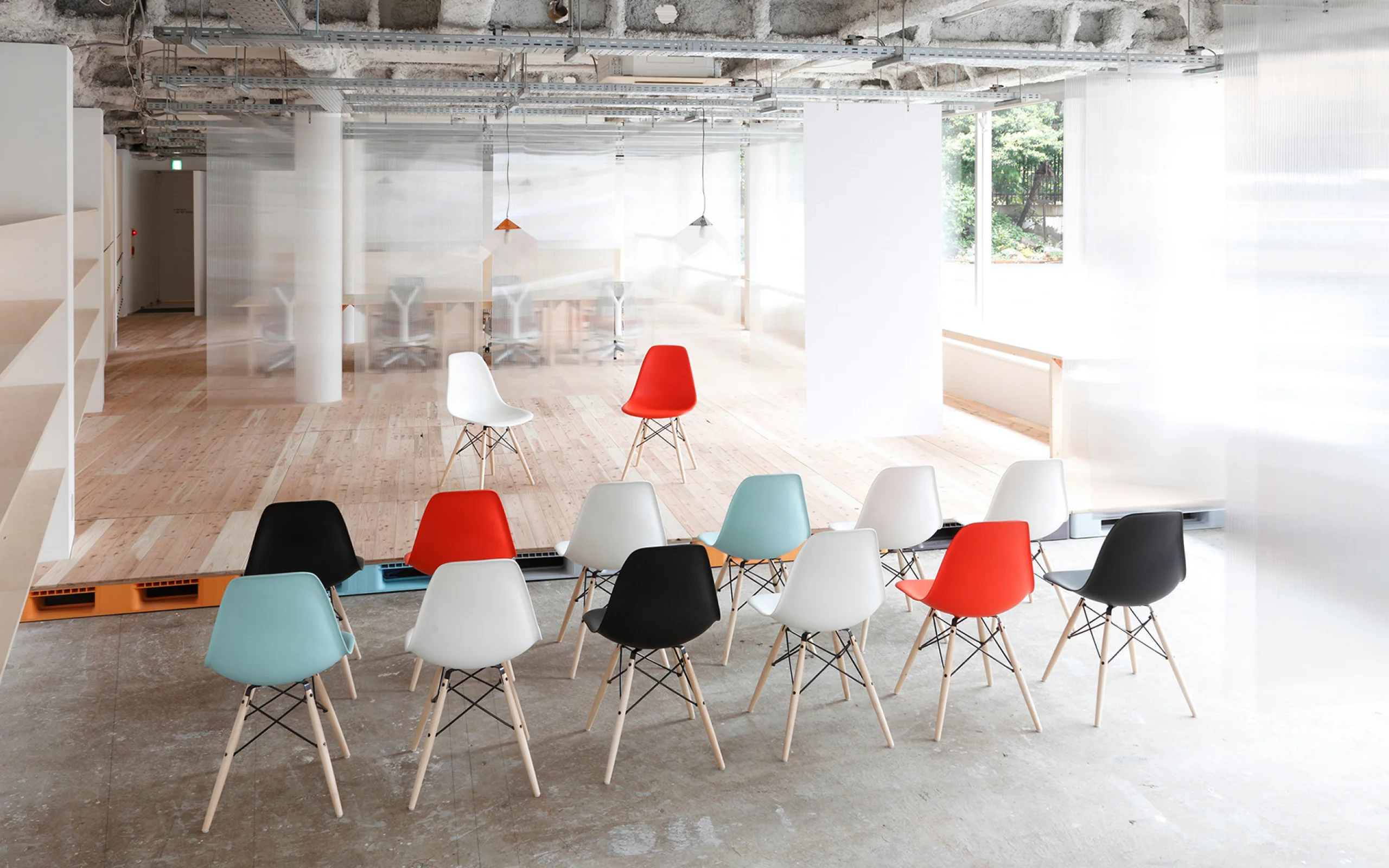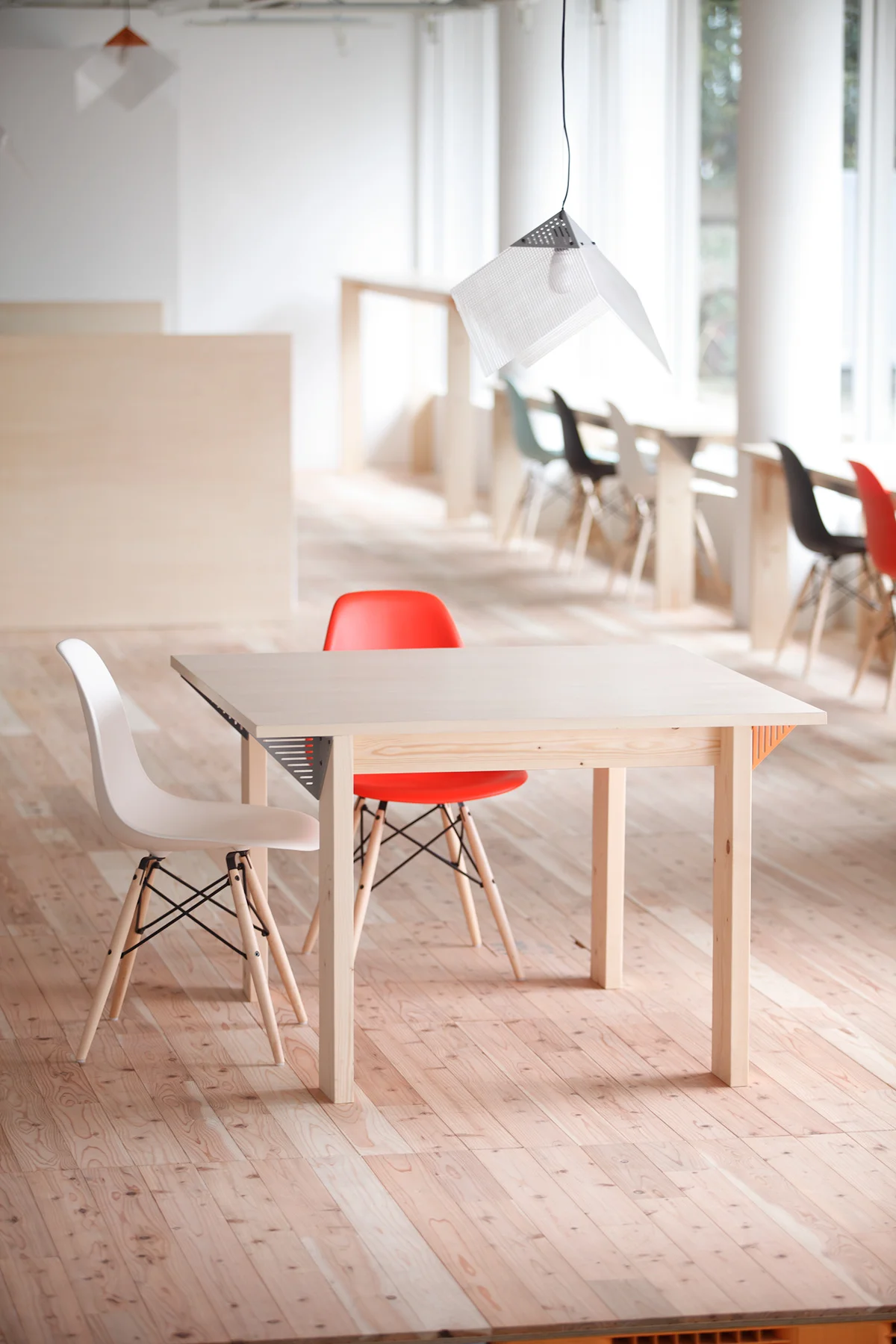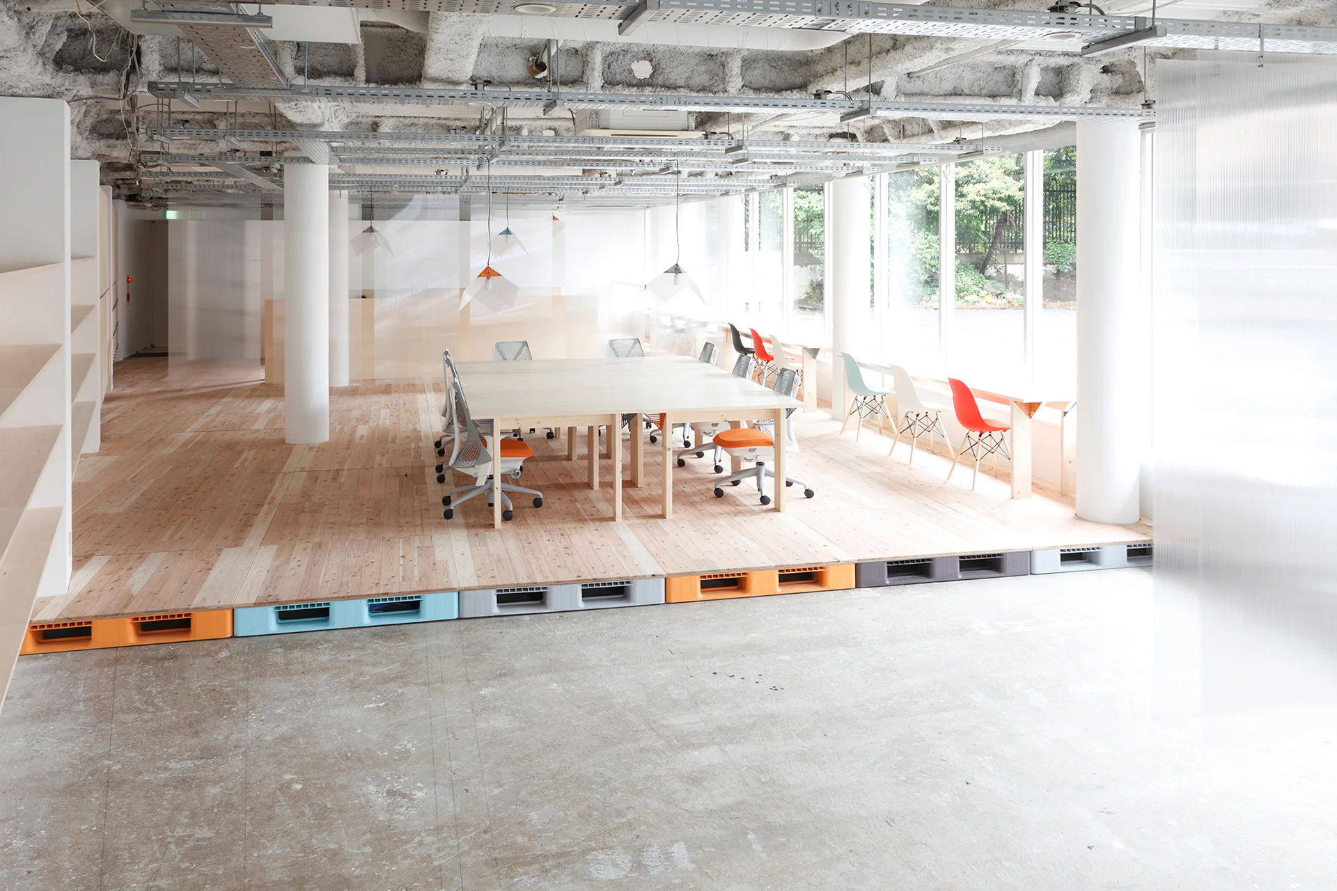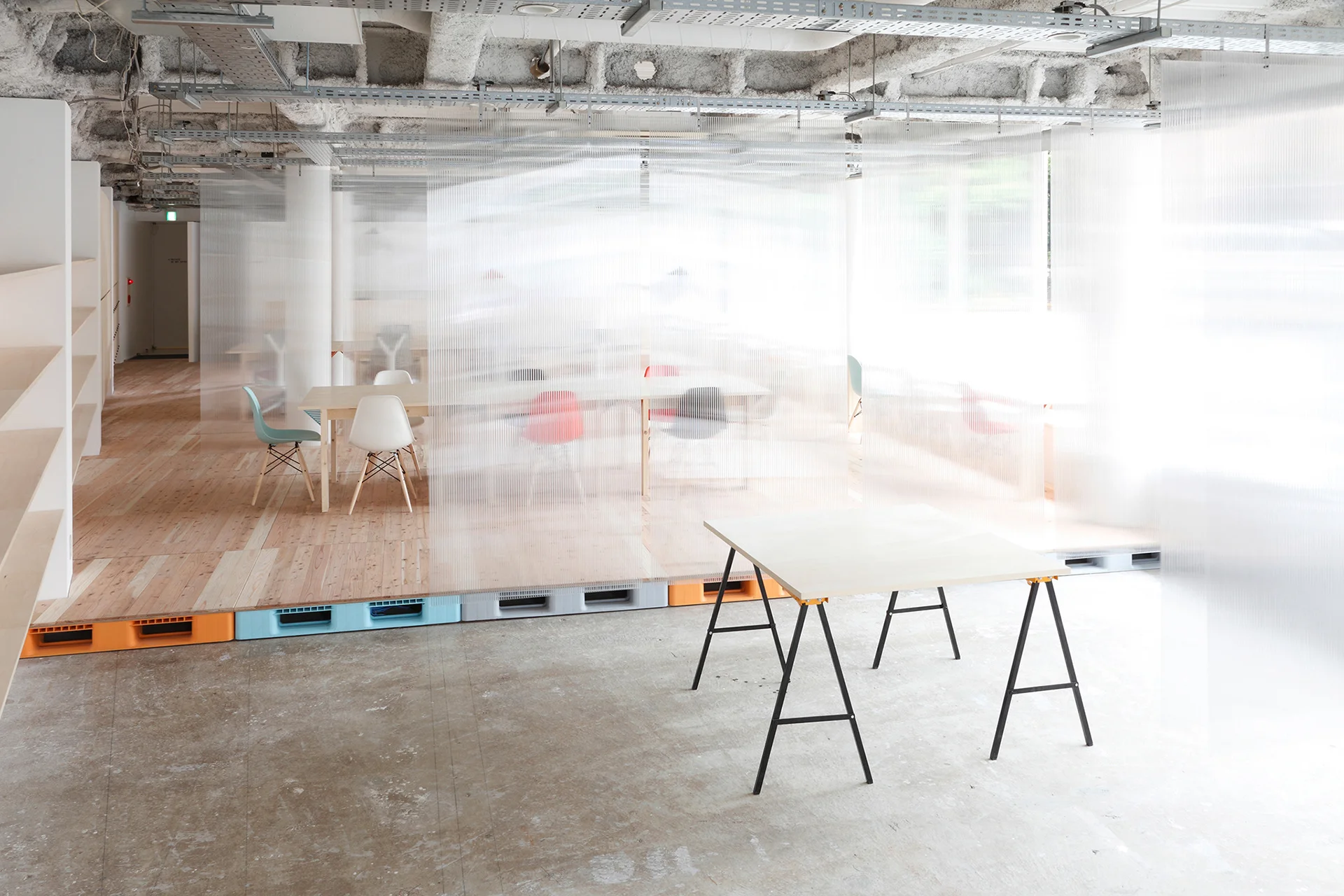 Mozilla Factory Spaceでは、ソフトを開発するエンジニアからワークショップに参加する子どもまでが共存することもあるため、パーテーションなどを活用することで、空間の奥に行くほどプライベートな作業環境が確保できるような設計にしました。
