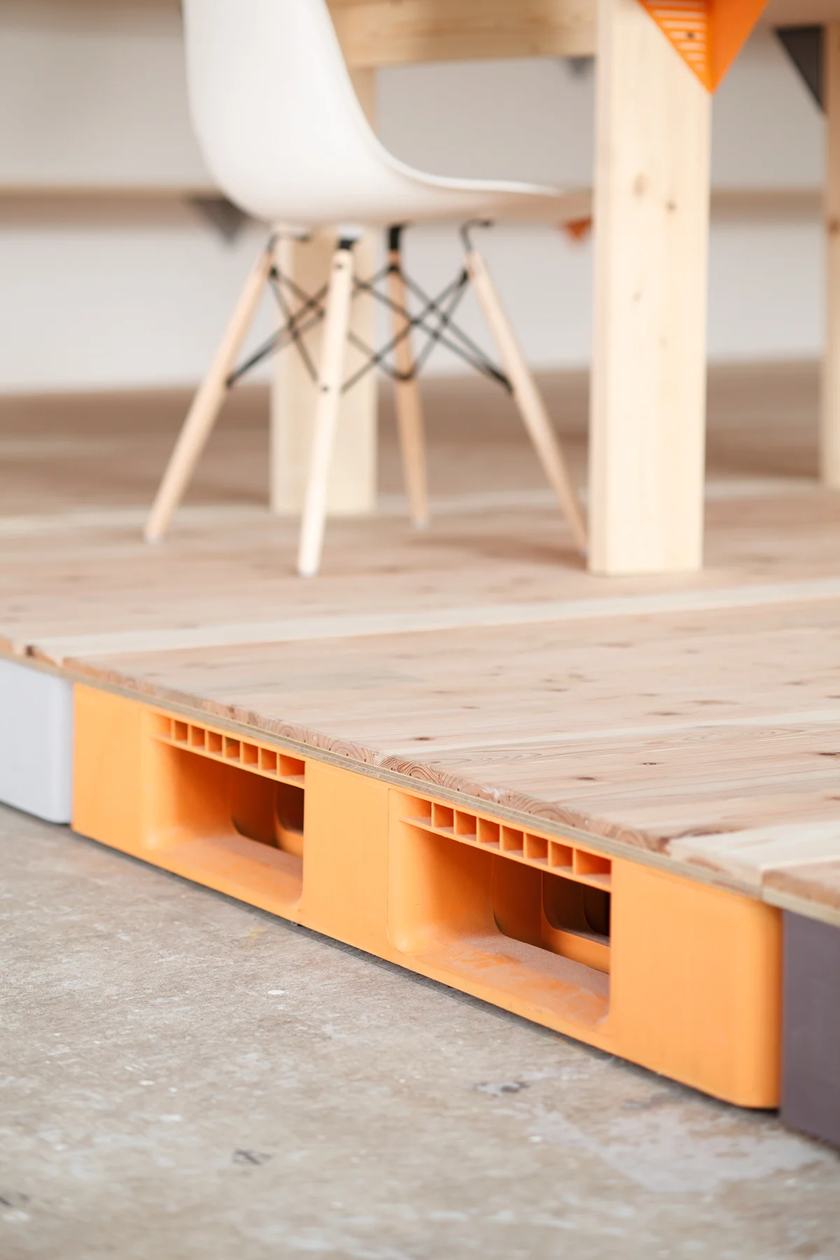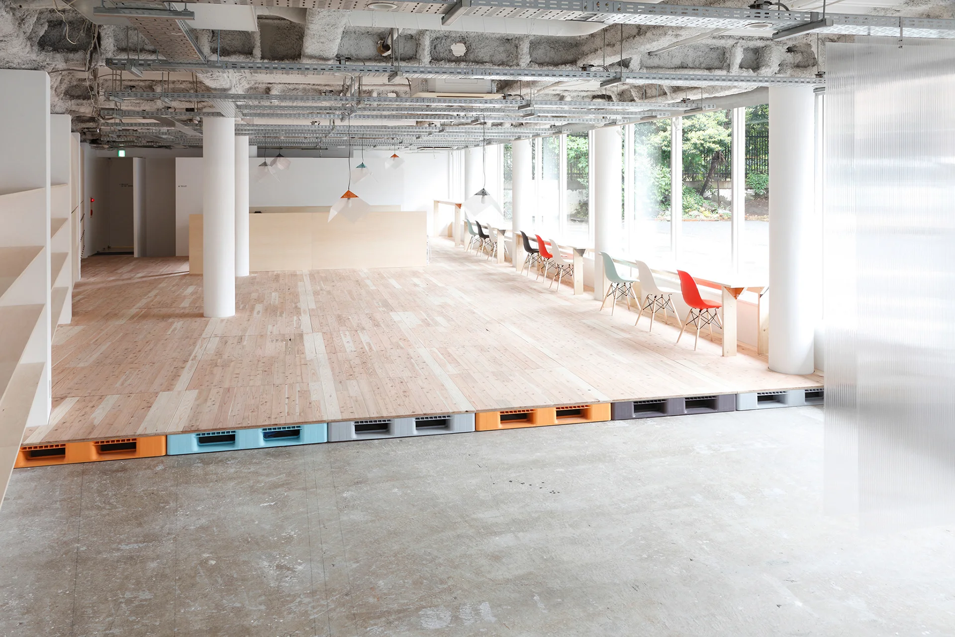 Mozilla Japanの新オフィス内にあるMozilla Factory Spaceの空間デザインを行いました。Mozillaが掲げるオープンソースの理念に基づき、一般に流通している製品を用いたオフィス空間では、透過性のあるポリカーボネイトパネルにより、目的に応じた空間を容易に構成することを可能にし、単一のコーナーモジュールで机や棚、ランプシェードなどをつくりました。また、物流パレットでOAフロアを構成することで、各所の点検口から内部に通したケーブル類を取り出し、使用することができます。サインは、ディスプレイ上に表示される文字のピクセル感を再現しており、近くに寄って見るとドットで構成されていることがわかります。これらの空間構成アイデアは、「Open Source Furniture」としてクリエイティブ・コモンズで公開しています。すべての図面・制作手順をオープンソースにすることで、誰でも安価に機能的なオフィスを構築することができるようになっています。