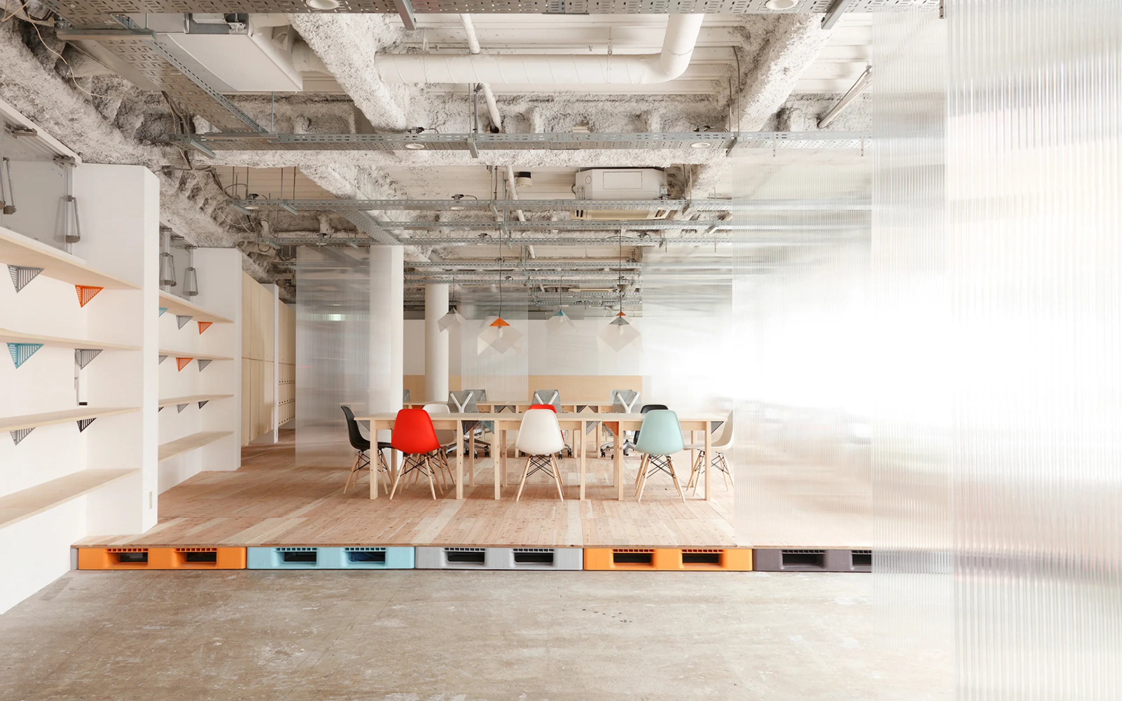 Mozilla Factory Spaceでは、ソフトを開発するエンジニアからワークショップに参加する子どもまでが共存することもあるため、パーテーションなどを活用することで、空間の奥に行くほどプライベートな作業環境が確保できるような設計にしました。