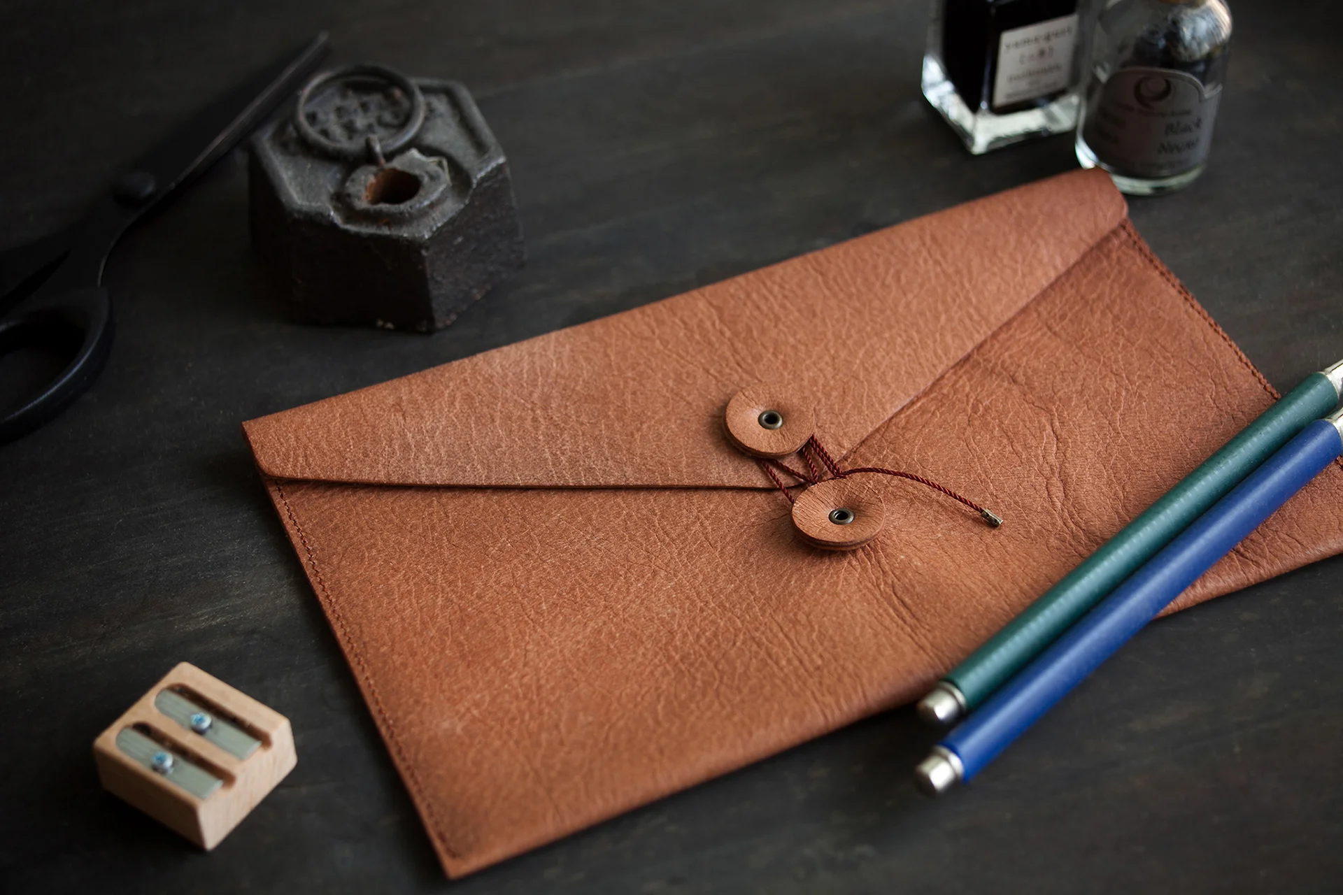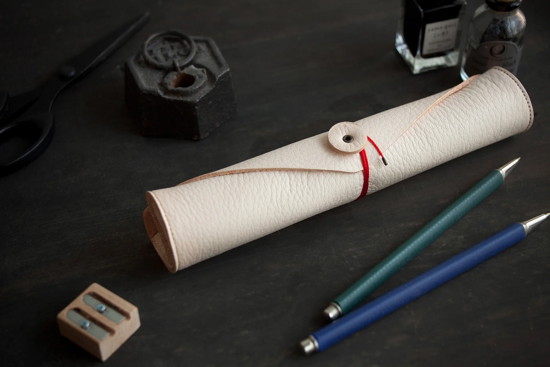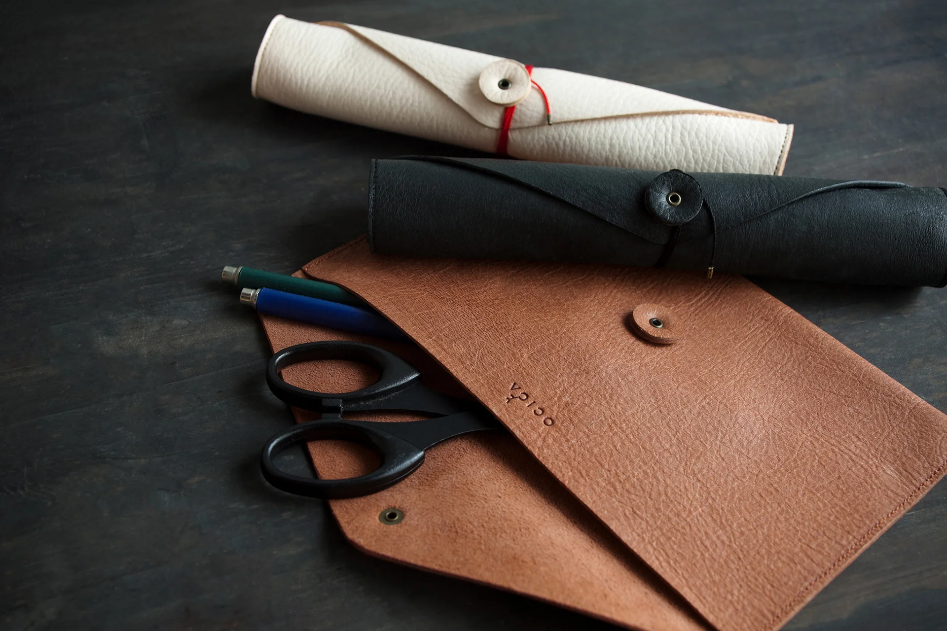 OCICAプロジェクトの第2弾として、2015年に製品デザインを行ったDEER LEATHER PEN CASEは、天然・野生の鹿革を用いたペンケースです。制作は、牡鹿半島・鮎川浜の障害者福祉サービス事業所の方々の仕事として行われており、一つひとつ丁寧に手仕事で縫製されています。封筒をモチーフにした形状ですが、漁港の補修糸でぐるぐると巻くロール形でも使用できる2WAY仕様で、容量や用途に合わせて使い分けることができます。