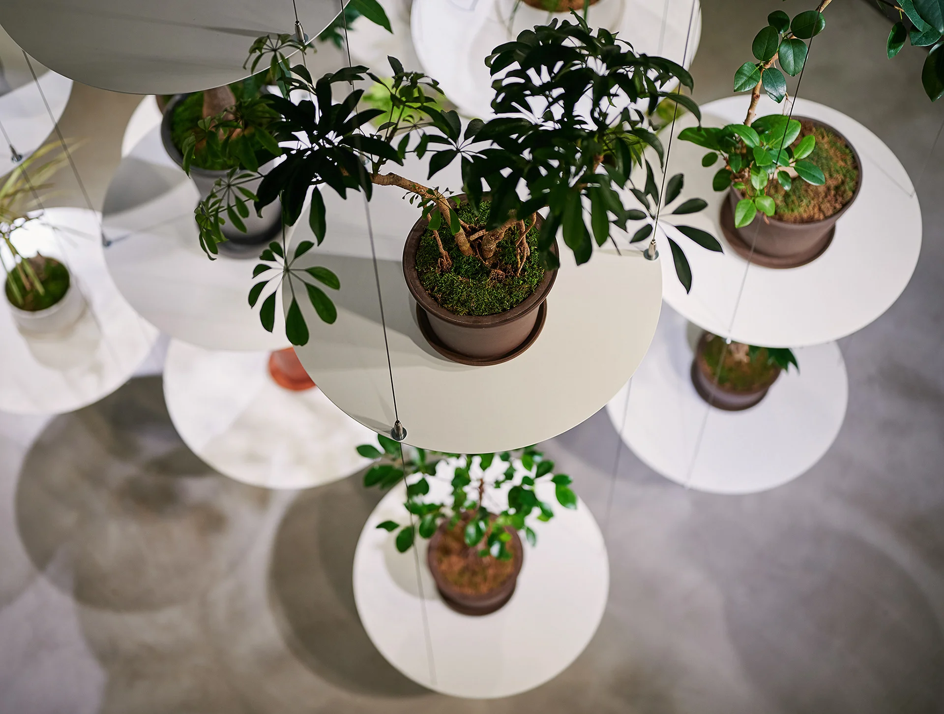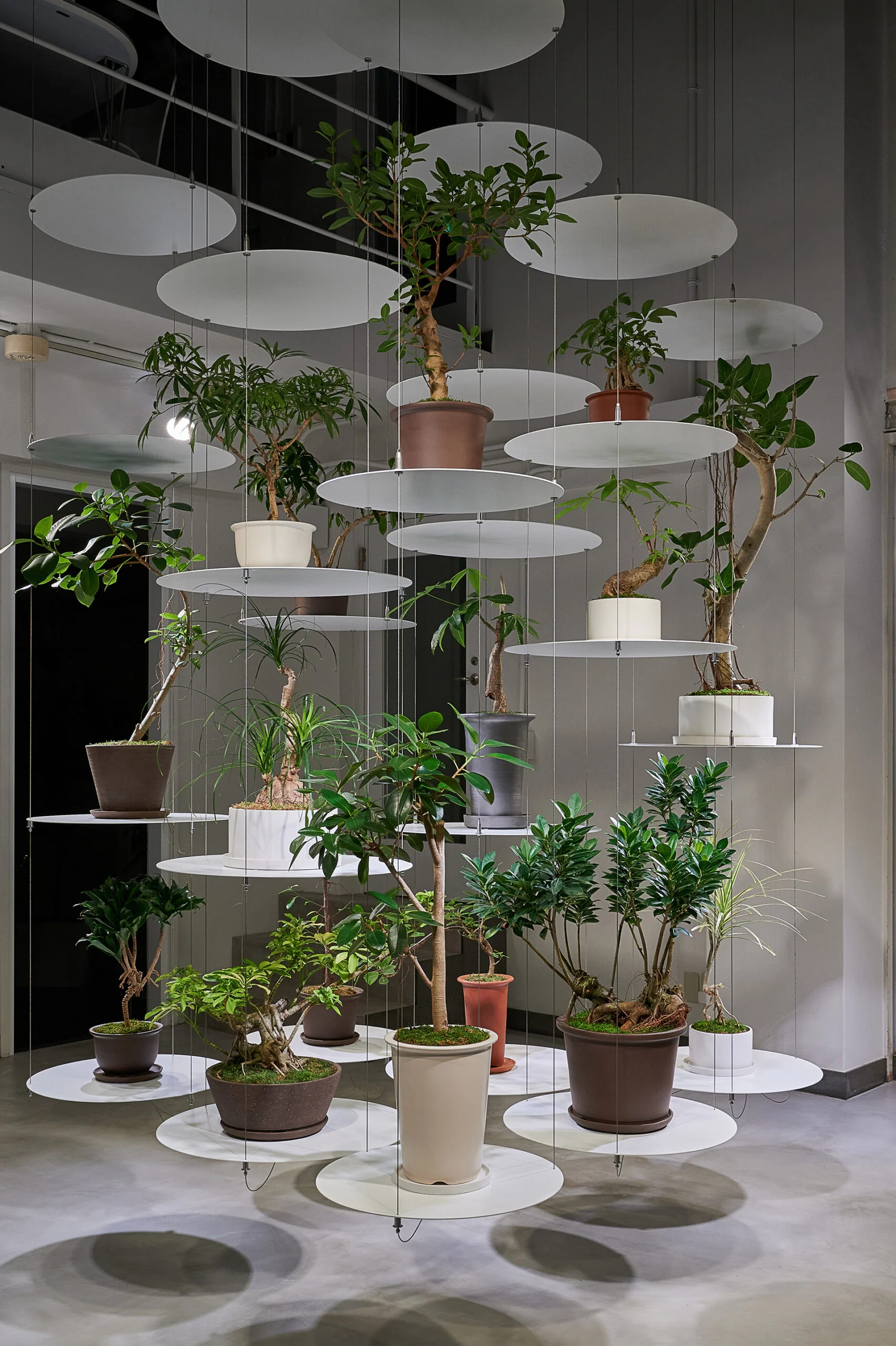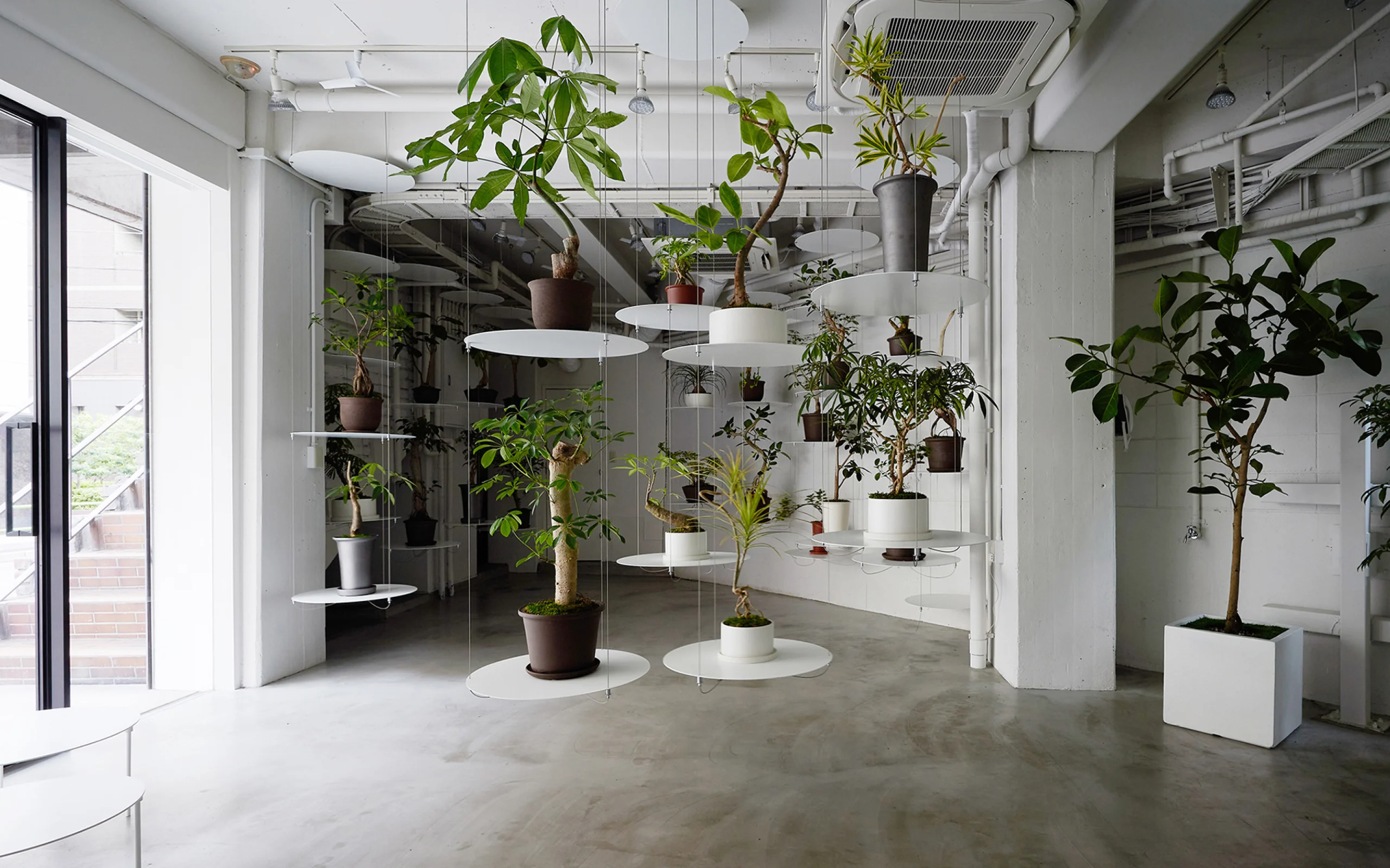 そんな空間を設計するにあたって私たちは、多くのグリーンショップのように植物の物量によって擬似的な自然をつくり出す手法ではなく、華道のように一つひとつの植物の美しさを際立たせる方法を模索しました。そして、植物を宙に浮かせて植物の一つ一つを活き活きと独立した存在として示す表現を採用しました。店舗全体をひとつの花器と見立て、個性に合わせて植物を空中に活けられるように、まさに植物のような有機性を備えた可動式のワイヤーシェルフをデザイン。このシェルフによって構成される空間は、それぞれの植物の生命力を際立たせ、一つひとつが大切な存在として表現されます。それは翻って、植物の健康状態が目に入りやすい店舗でもあるのです。こうして、一つひとつの植物を美しく輝かせるとともに、植物のヘルスケアという観点からウェルビーイングにも重きを置く、全く新しいコンセプトの植物店が完成しました。