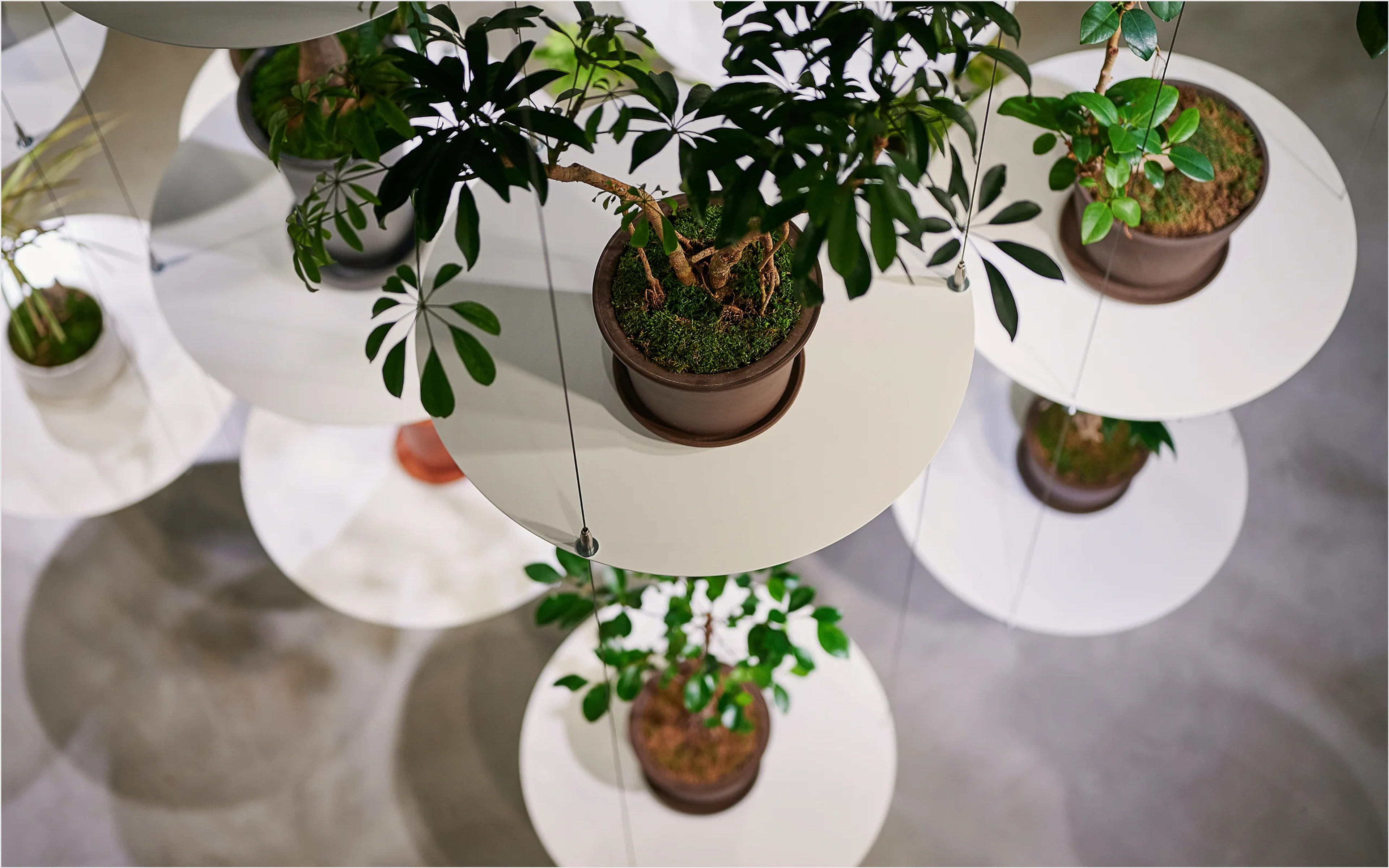 そんな空間を設計するにあたって私たちは、多くのグリーンショップのように植物の物量によって擬似的な自然をつくり出す手法ではなく、華道のように一つひとつの植物の美しさを際立たせる方法を模索しました。そして、植物を宙に浮かせて植物の一つ一つを活き活きと独立した存在として示す表現を採用しました。店舗全体をひとつの花器と見立て、個性に合わせて植物を空中に活けられるように、まさに植物のような有機性を備えた可動式のワイヤーシェルフをデザイン。このシェルフによって構成される空間は、それぞれの植物の生命力を際立たせ、一つひとつが大切な存在として表現されます。それは翻って、植物の健康状態が目に入りやすい店舗でもあるのです。こうして、一つひとつの植物を美しく輝かせるとともに、植物のヘルスケアという観点からウェルビーイングにも重きを置く、全く新しいコンセプトの植物店が完成しました。