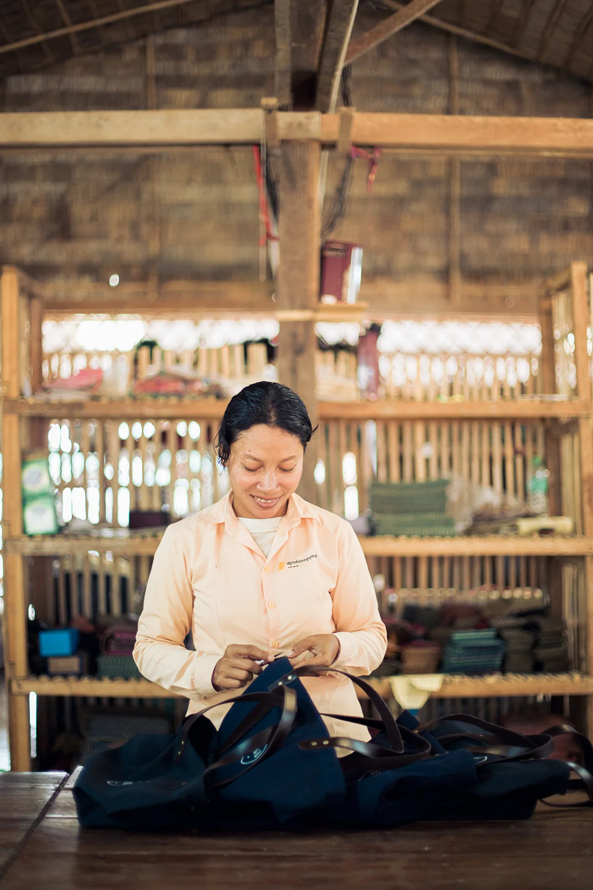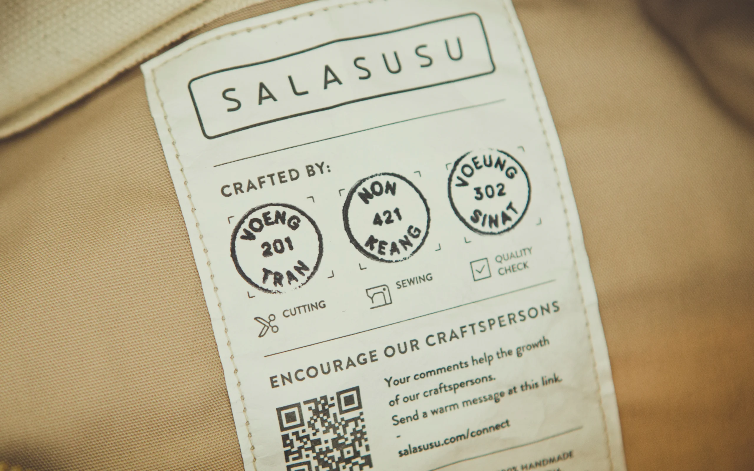 商品タグには、各工程を担当したつくり手のスタンプが押されています。カンボジア・シェムリアップ近郊にある工房で働くスタッフ全員が自らのスタンプを持ち、商品タグに一つひとつに手押しすることで、誰がこの商品をつくったのかを買い手はひと目で知ることができ、同時につくり手にも責任感を持ってものづくりに励んでもらうことを目指しています。