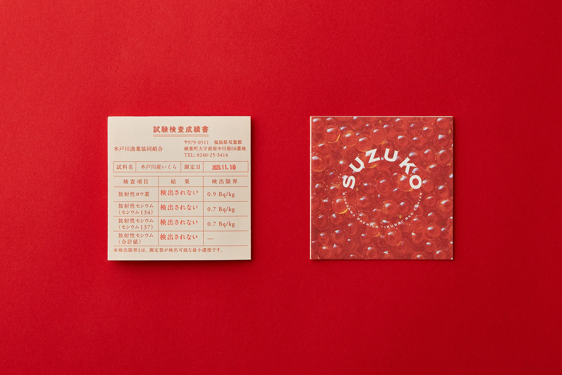 デザインでは、美味しさと安全性を訴求するブランディングを行いました。究極の一品にふさわしい高級感を持たせるためにゴールドの缶を使用しており、まるで赤いキャビアのように美しく煌きます。ロゴマークは、木戸川のいくらを太陽に見立てています。原発事故の影響で著しく評価が下がった木戸川のいくらに、夜明けのイメージを重ね合わせることで、福島の水産業の復活への願いを表現しています。さらに、安全面の認証試験をクリアしていることを示す保証書もデザインしました。こちらは、落ち着いたトーンにすることで安心感・信頼感を与えます。