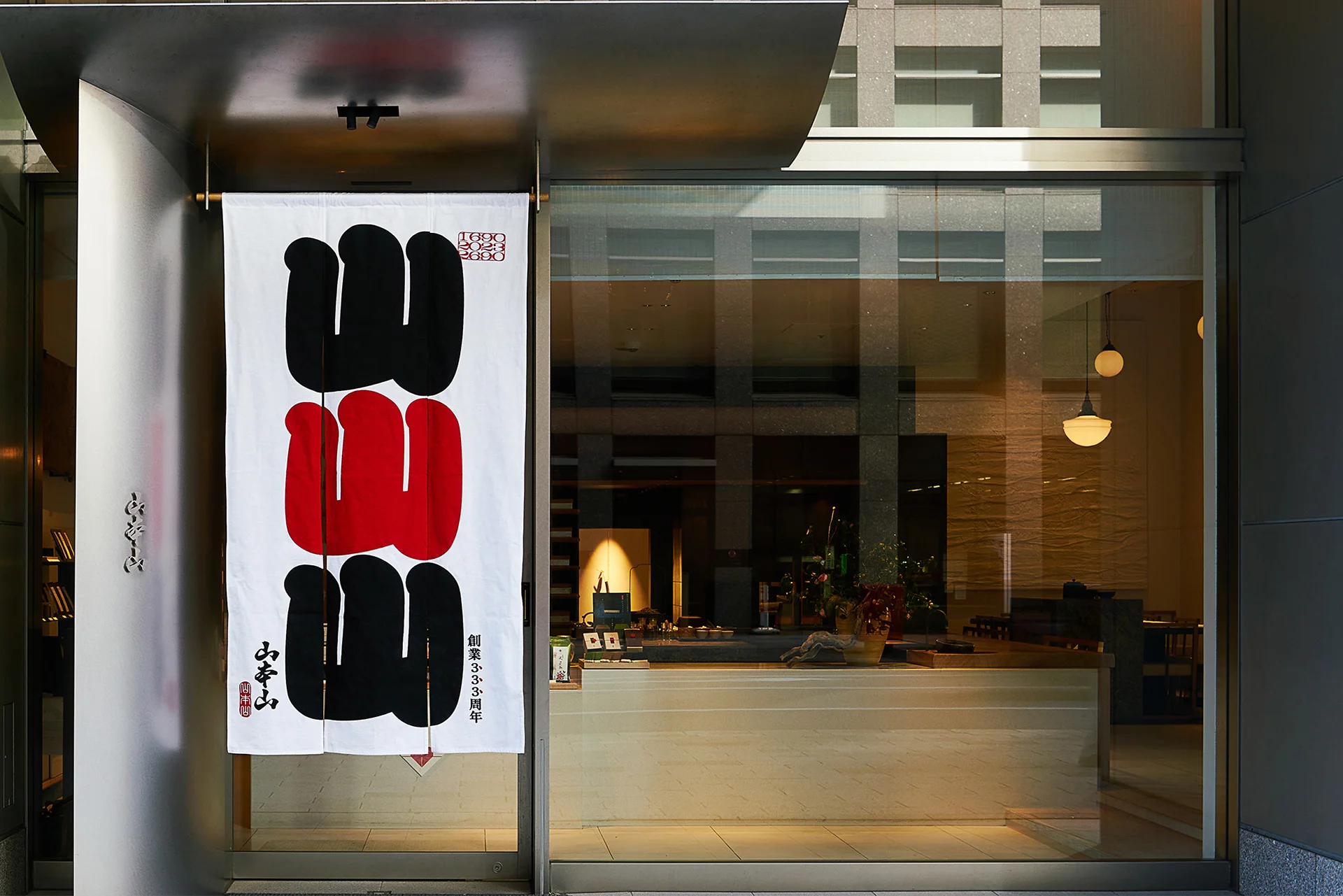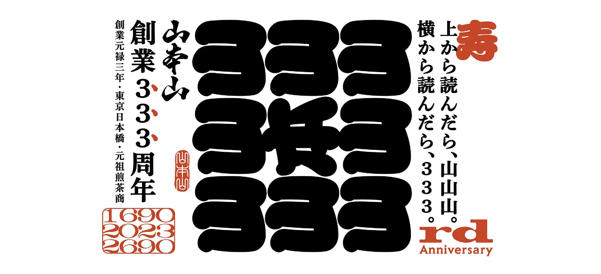 創業333周年を記念したロゴでは、江戸時代の図案文字を現代的にアレンジした「山」の字を配置。山の音読みは「サン」であり、山を90度回転させると「3」に。「上から読んだら山山山、横から読んだら333」という言葉遊びであり、「上から読んでも山本山、下から読んでも山本山」という往年のCMのフレーズへのオマージュにもなっています。