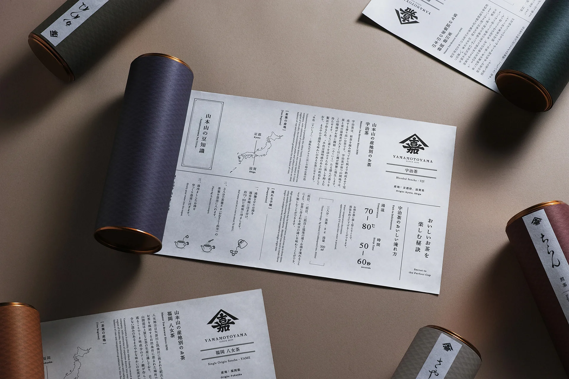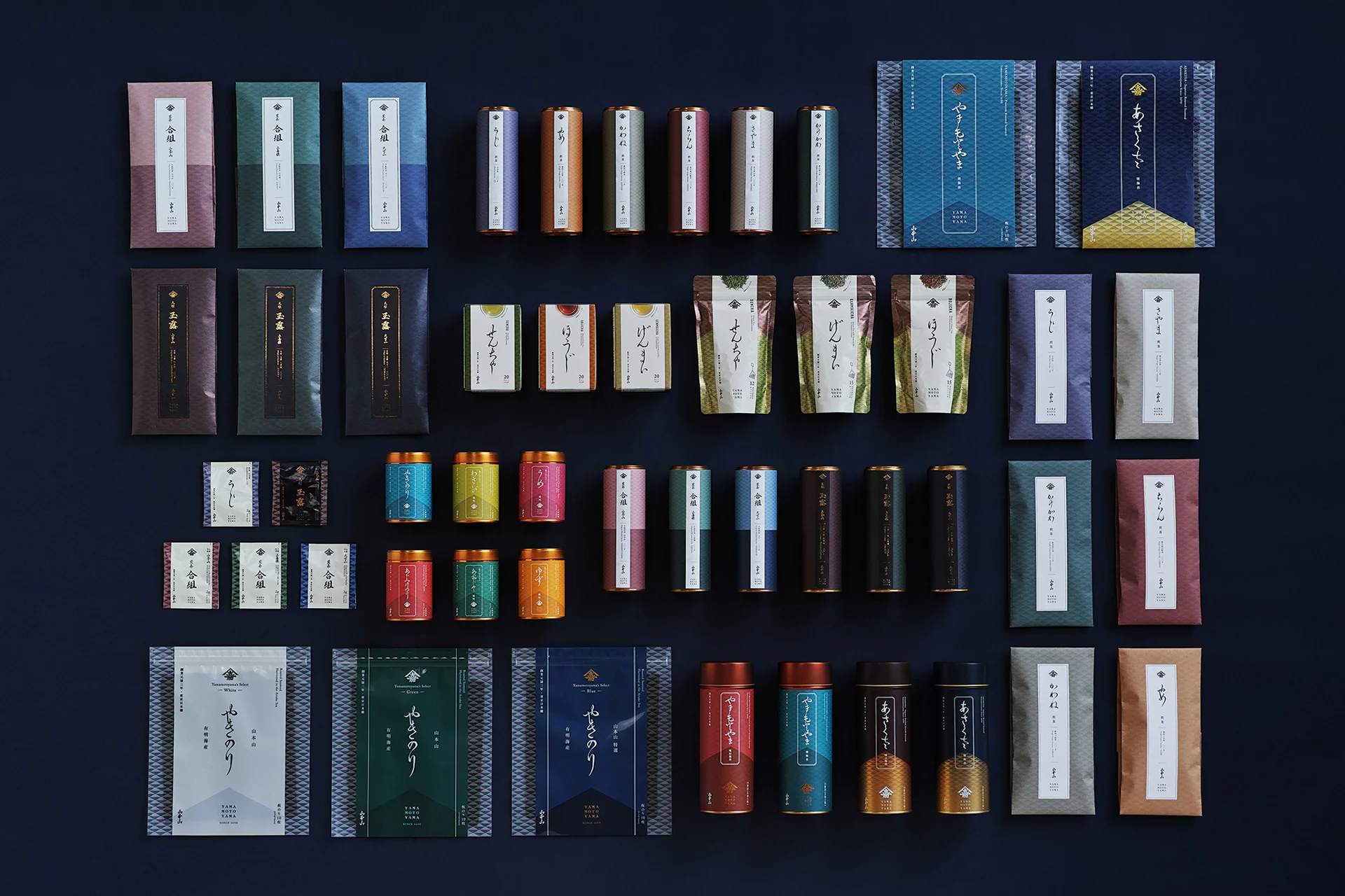 山本山のリブランディングにあたって、江戸時代に端を発する老舗企業というポジショニングを明確にするために、「江戸の粋への原点回帰」をコンセプトに据えました。そして、創業期の「山本嘉兵衛商店」だった時代のお品書きや広告などに使われていた「山嘉」の屋号紋を復活させ、同じく1690年頃に流行していた英字書体と合わせることで、江戸時代の美意識や空気感を再現し、原点回帰するブランドロゴを設計しました。さらに既存商品においても、山本山オリジナルの小紋柄や江戸の書風を取り入れるとともに、江戸の伝統的な色や巻物という書物の構造を引用することによって、老舗の魅力を保ちつつ、現代的で格調高いパッケージへとリデザインしています。江戸から続く老舗企業という歴史や、従来の山本山の美意識の延長線上でリブランディングを行ったことによって、新商品と既存商品を違和感なく売場に並べることを可能にし、それによって、在庫を一斉に入れ替えるリスクを回避しながら、ゆるやかに新しいブランドへとシフトしていくプロセスを取ることができました。