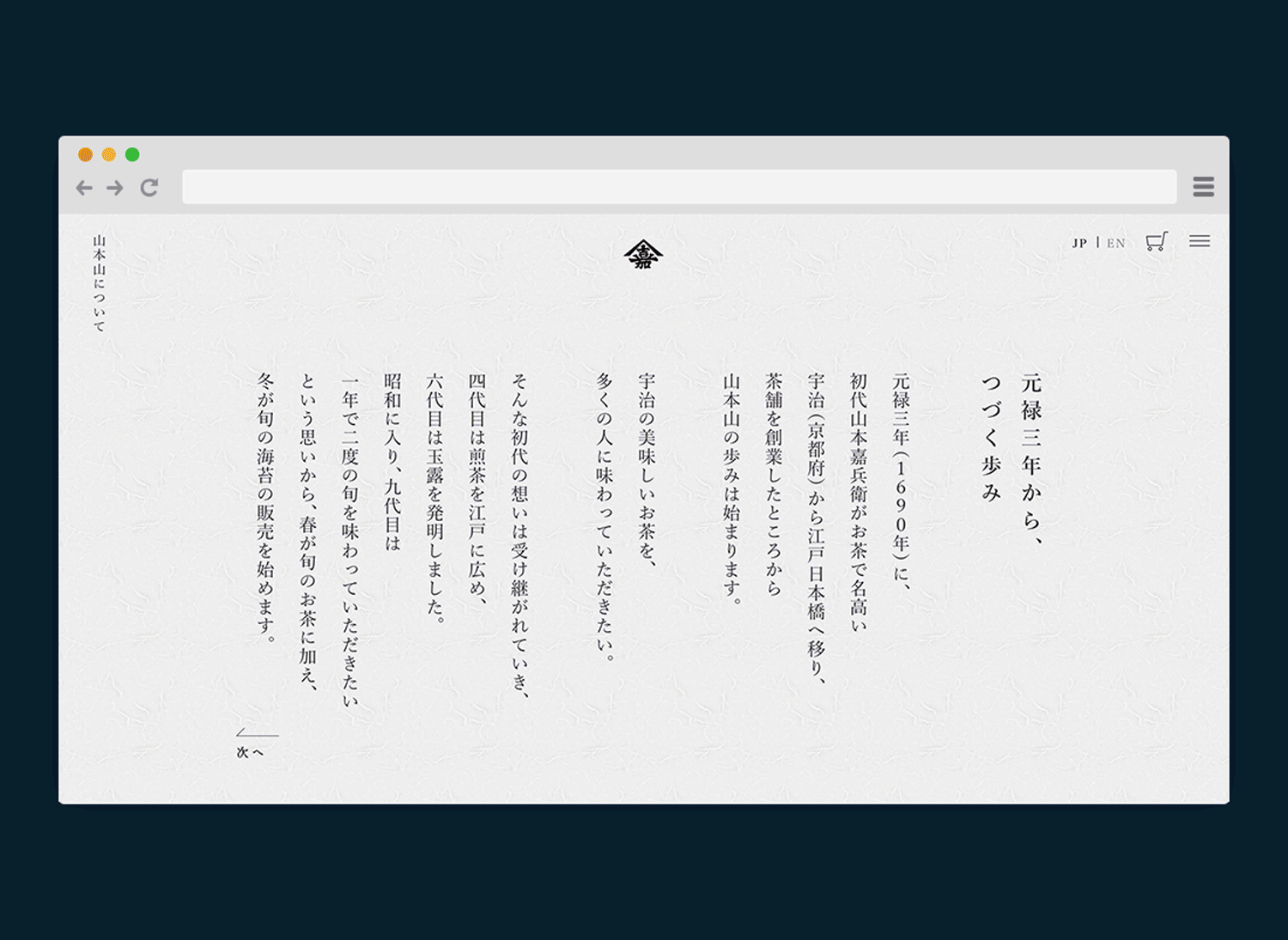330年以上続く日本を代表する老舗のブランドとして、WEBデザインで意識したのは、いかに江戸の美意識を現代的に伝えるかでした。縦組みのタイポグラフィを取り入れ、背景には和紙のテクスチャを配置。江戸期の書物のエレメントに習うことで、老舗らしく、かつモダンな、タイムレスなウェブデザインを目指して製作しました。