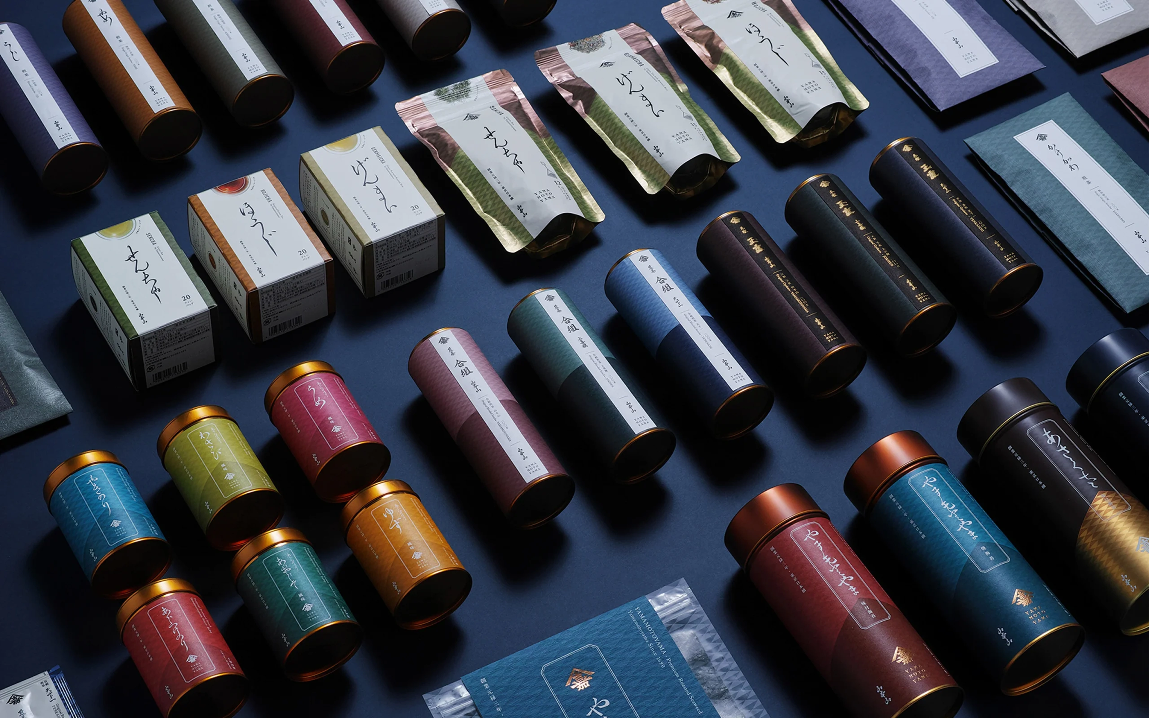 山本山のリブランディングにあたって、江戸時代に端を発する老舗企業というポジショニングを明確にするために、「江戸の粋への原点回帰」をコンセプトに据えました。そして、創業期の「山本嘉兵衛商店」だった時代のお品書きや広告などに使われていた「山嘉」の屋号紋を復活させ、同じく1690年頃に流行していた英字書体と合わせることで、江戸時代の美意識や空気感を再現し、原点回帰するブランドロゴを設計しました。さらに既存商品においても、山本山オリジナルの小紋柄や江戸の書風を取り入れるとともに、江戸の伝統的な色や巻物という書物の構造を引用することによって、老舗の魅力を保ちつつ、現代的で格調高いパッケージへとリデザインしています。江戸から続く老舗企業という歴史や、従来の山本山の美意識の延長線上でリブランディングを行ったことによって、新商品と既存商品を違和感なく売場に並べることを可能にし、それによって、在庫を一斉に入れ替えるリスクを回避しながら、ゆるやかに新しいブランドへとシフトしていくプロセスを取ることができました。