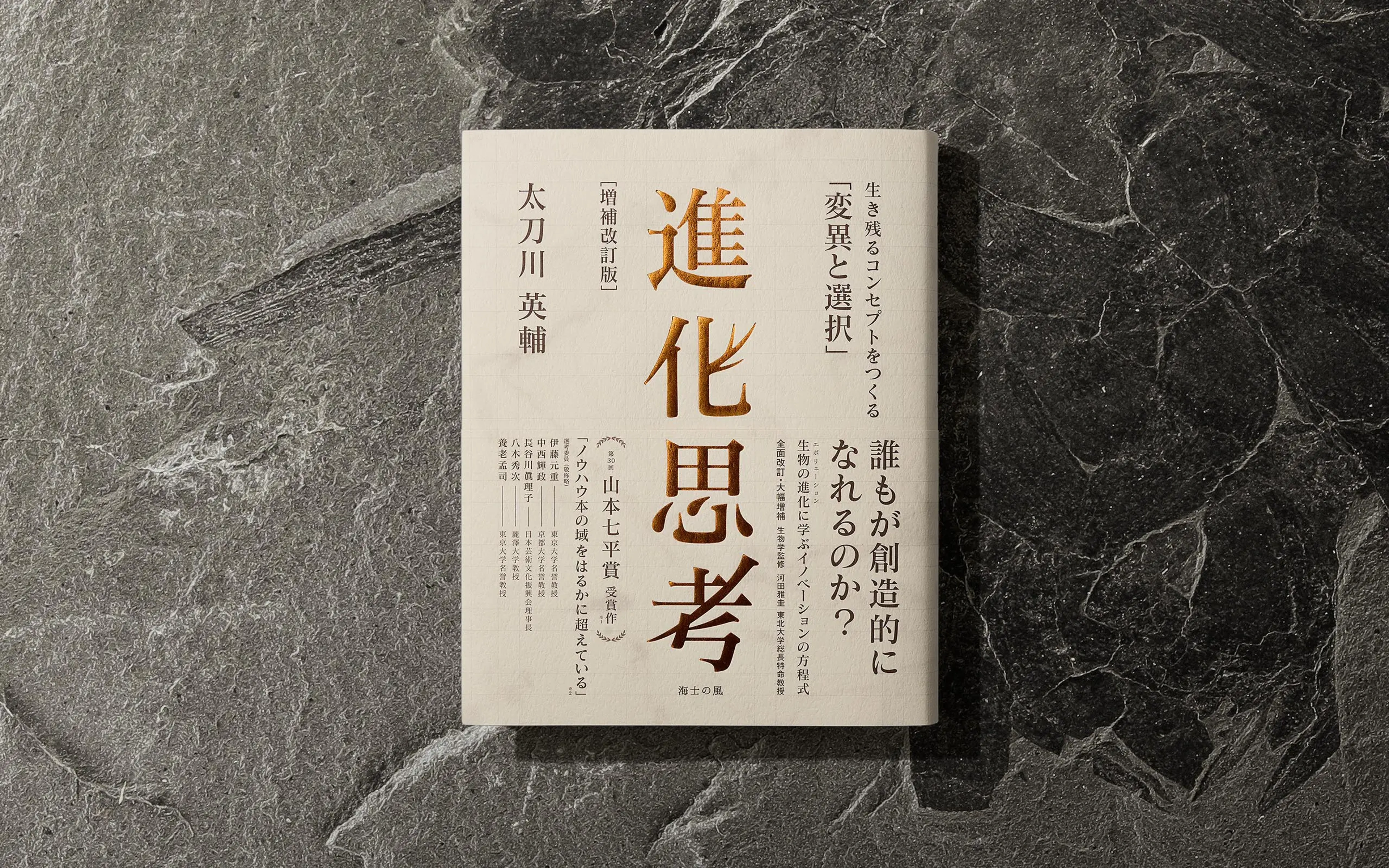 O logotipo do título do livro mostra os quatro caracteres kanji (進 化 思 考) em transição baseados nos padrões de mutação da Criatividade Evolucionária de Proliferar, Assimilar, Reverter e Variar. Quando a capa de papel é removida, a capa do livro mostra os mesmos quatro caracteres kanji como representações visuais das quatro ideias do aprendizado espaço-temporal: Anatomia, Linhagem, Ecossistema e Predição.