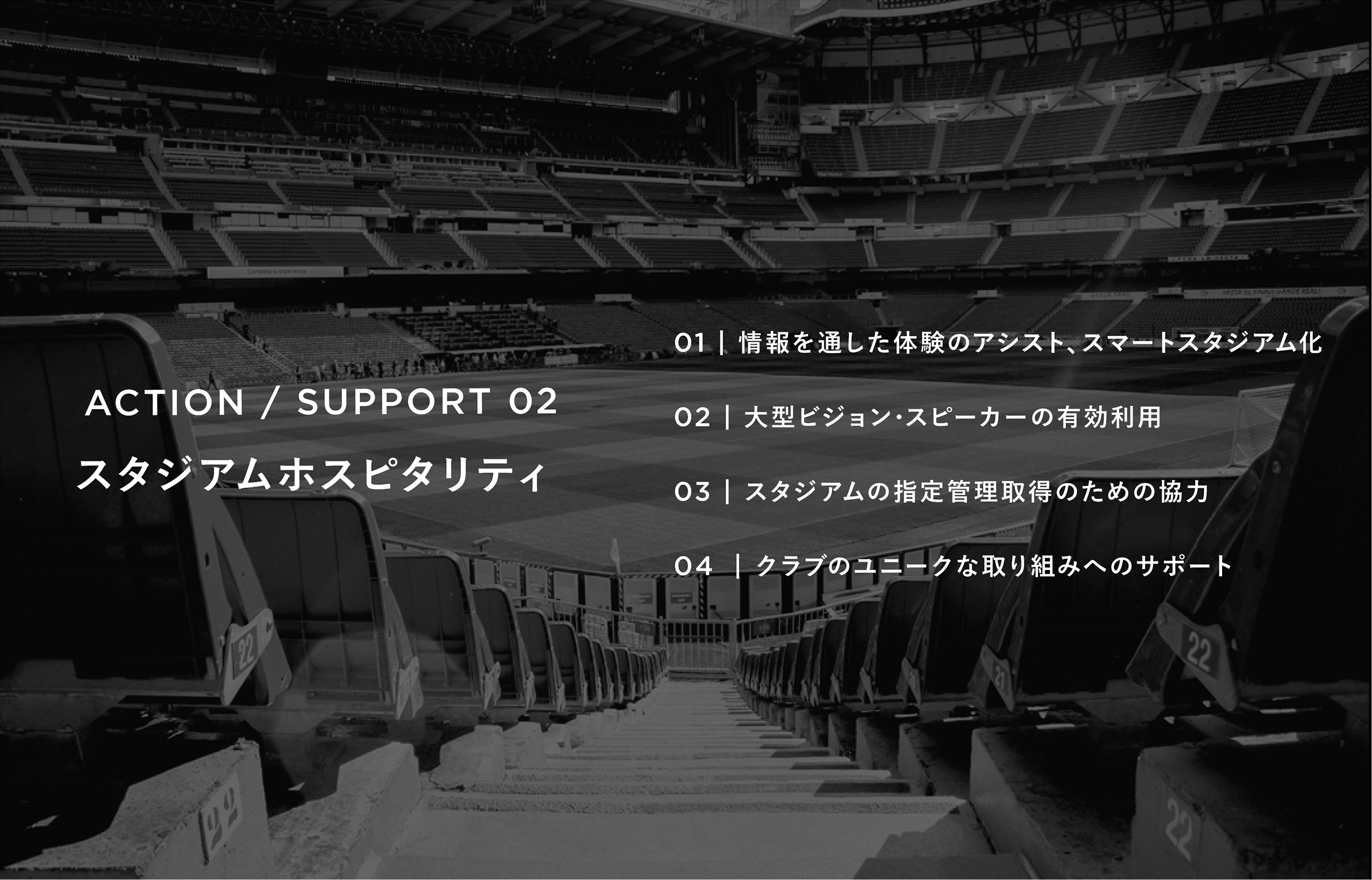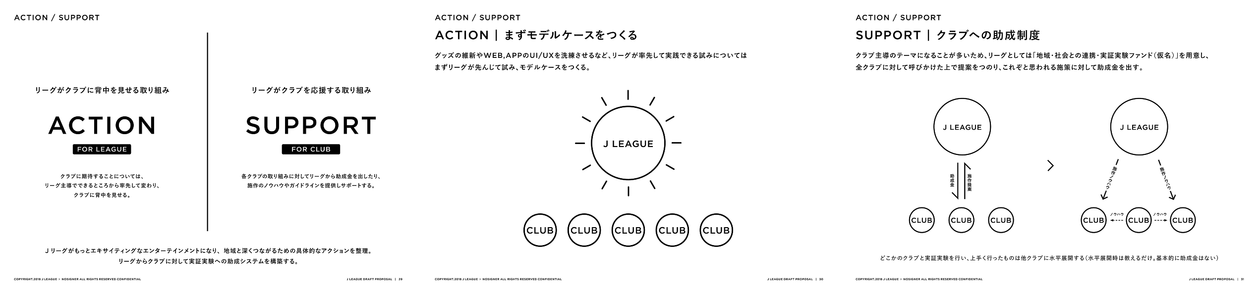 Tulipendekeza mfumo ambapo J.League yenyewe ingechukua uongozi katika kuweka mfano—KITENDO—kuonyesha vilabu njia ya mbele kwa kuanzisha kesi za kielelezo. Wakati huo huo, tuliunda utaratibu ambao ungetoa msaada kupitia ruzuku kwa miradi ya utangulizi ya vilabu kwa ushirikiano na jamii za mitaa na jamii, kusambaza mazoea yenye mafanikio katika vilabu nyingine. Kwa kuunganisha uhusiano wa ligi–vilabu kuizunguka anga hizi mbili za KITENDO na MSAADA, tulianzisha muundo wa mageuzi endelevu ya J.League.