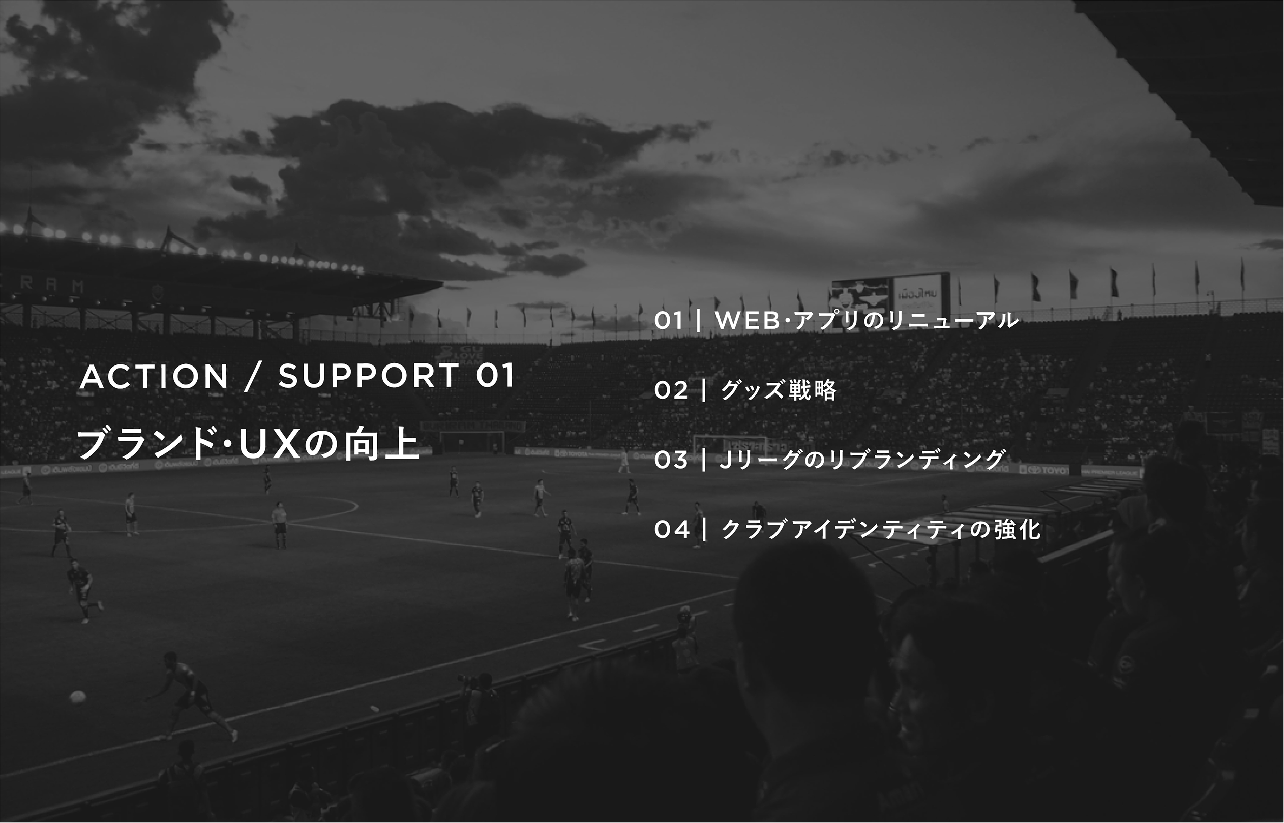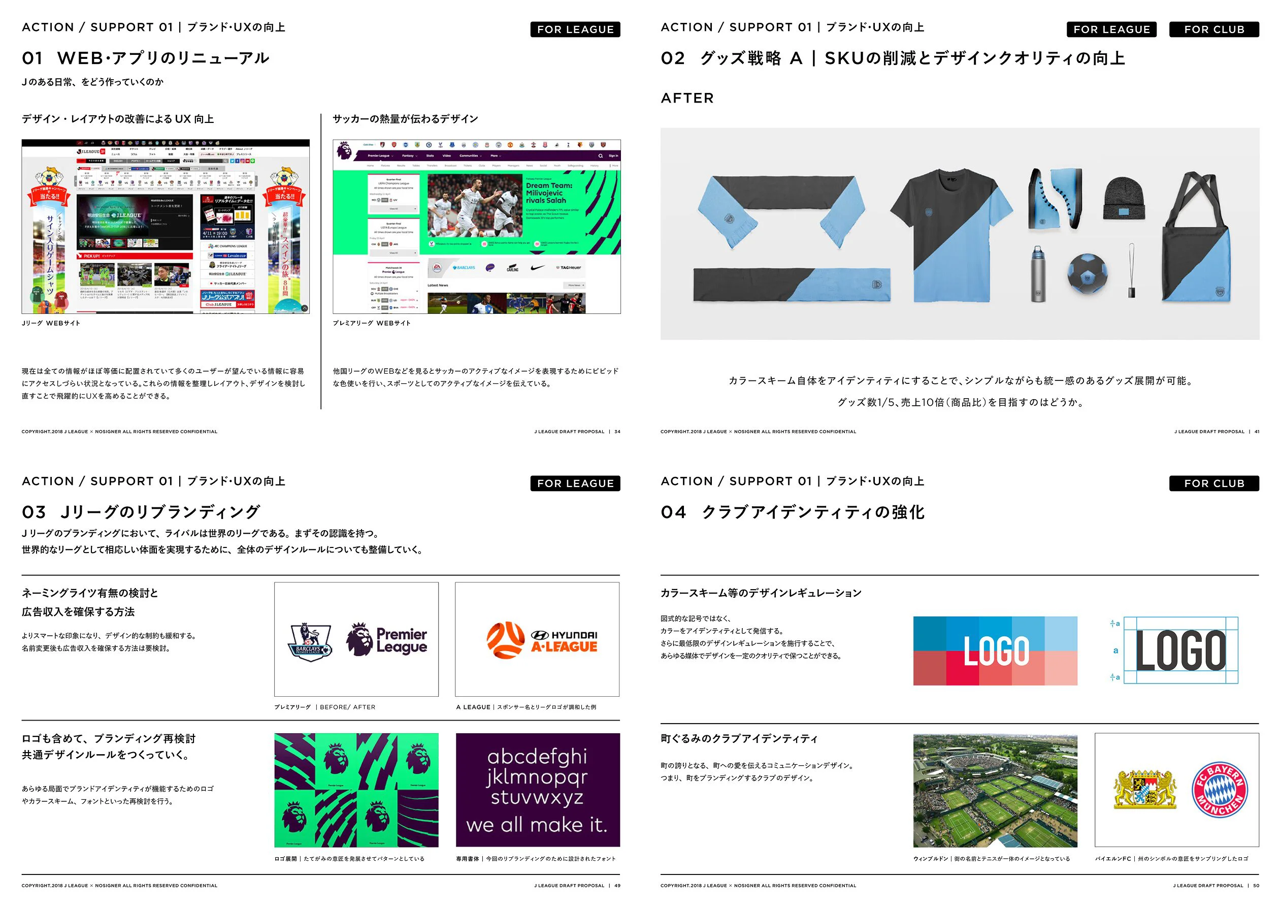 Kama VITENDO halisi vinavyoongozwa na ligi, tulizindua nguzo tano: "Uimarishaji wa Chapa na UX," "Ukaribisha wa Uwanja," "Ushirikiano wa Jamii na Kijamii," "Kufanya Mpira wa Miguu Kufikika Zaidi," na "Kuimarisha Uaminifu wa Ligi-Klabu." Tulipendekezea mipango mbalimbali ya uvumbuzi wa mahali pa kugusana: maboresho ya UX ya tovuti rasmi na programu, uzoefu wa uwanja mahiri, sheria za ukuzaji wa bidhaa za uuzaji zilizorekebishwa, upatikanaji wa wateja wapya kupitia utambulisho wa bidhaa, uzalishaji wa uwanja, na muundo mpya wa onyesho kubwa. Zaidi ya hayo, tuliunda mazingira rafiki kwa watoto na wanaoanza na kujenga upya mahusiano ya klabu-jamii—yote yamefasiriwa katika TODOs za kufanya.