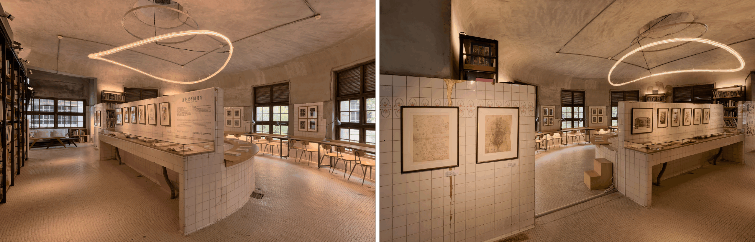 展览厅展示了"进化创意图书馆",这是一个收藏历史上自然科学家文献的图书馆。