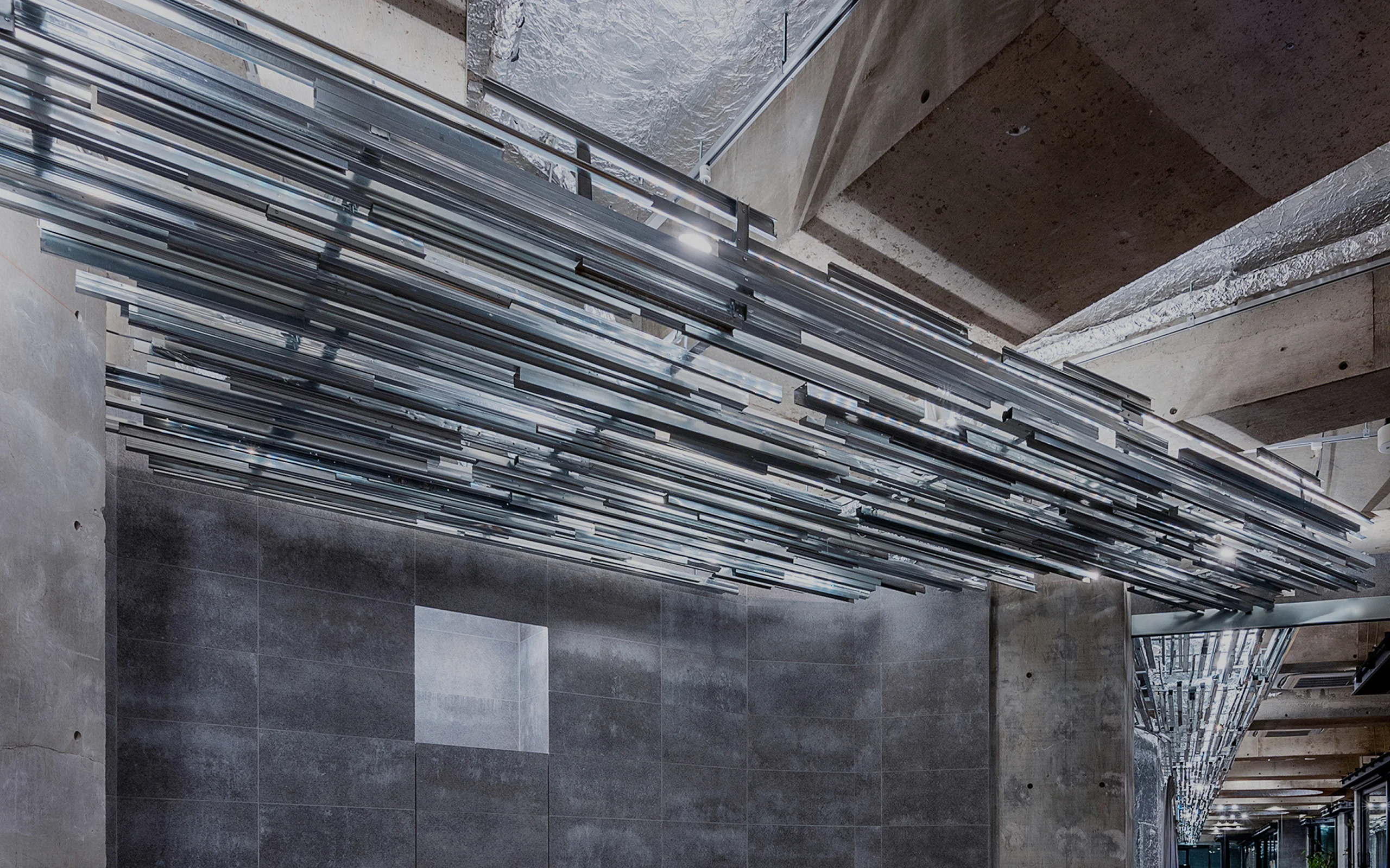 我们通过切割剩余的轻钢龙骨并随机排列这些片段,成功设计出了极具特色的天花板百叶窗。除了容纳照明设备外,这些百叶窗还用来隐藏无法移至他处的大量线路和管道。