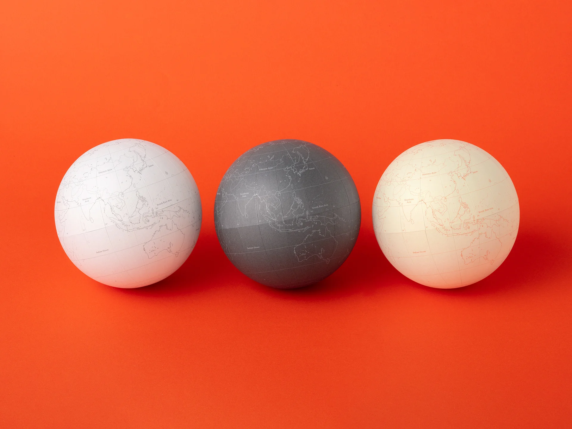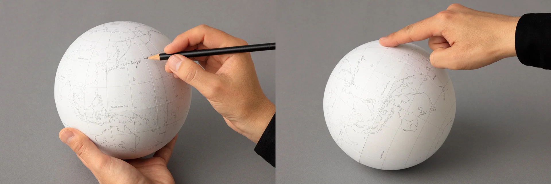 我们想要制造最简单、最美丽的地球仪。我们与一家老牌地球仪制造商合作,制作了这个无支架的地球仪。这是一个白色地图地球仪,内置配重,使地球仪像球类玩具一样移动。表面覆盖着耐用且书写舒适的纸张,让您可以直接在地球仪上写下想去的地方或旅行日记。