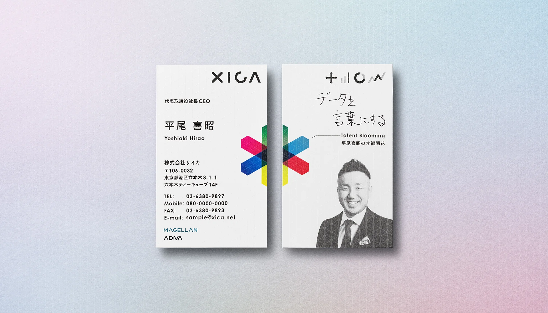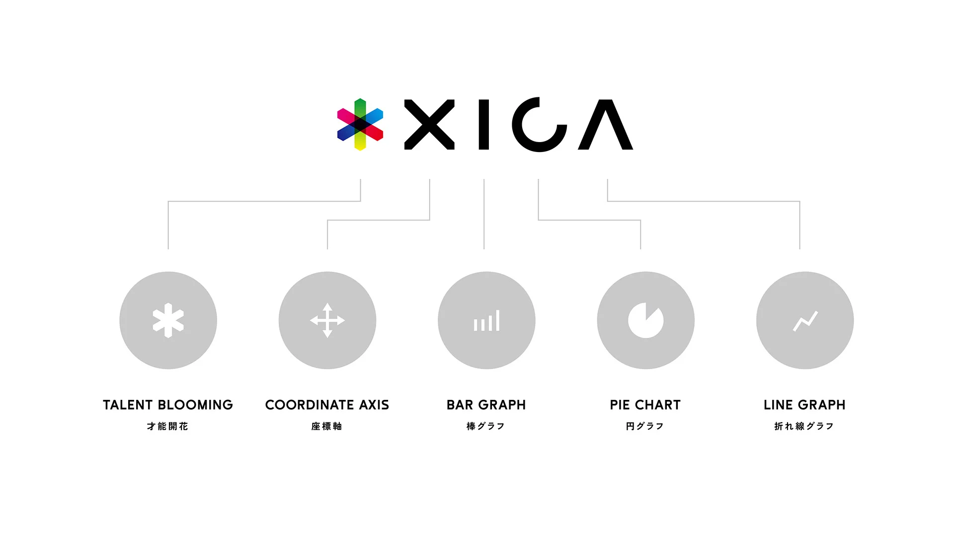 基于公司"通过数据科学的力量支持那些努力实现'saino kaika'(才能绽放)的人们"这一理念,我们以XICA这个名称设计了一个以星号图案表达的标志,代表着多样化才能的绽放。该标志由3条线构成,呈现出从印刷媒体使用的3种原色成分C(青色)、M(洋红色)和Y(黄色)开始,过渡到屏幕媒体使用的3种光的原色R(红色)、G(绿色)和B(蓝色)的渐变效果,象征着所有形式的媒体在三维空间中的交汇。此外,在标识字体设计中,我们将名称的每个字母比作图形元素,其中X代表坐标轴,I代表条形图,C代表饼图,A代表多边形折线图,这种视觉象征传达了公司分析各种数据的工作内容。