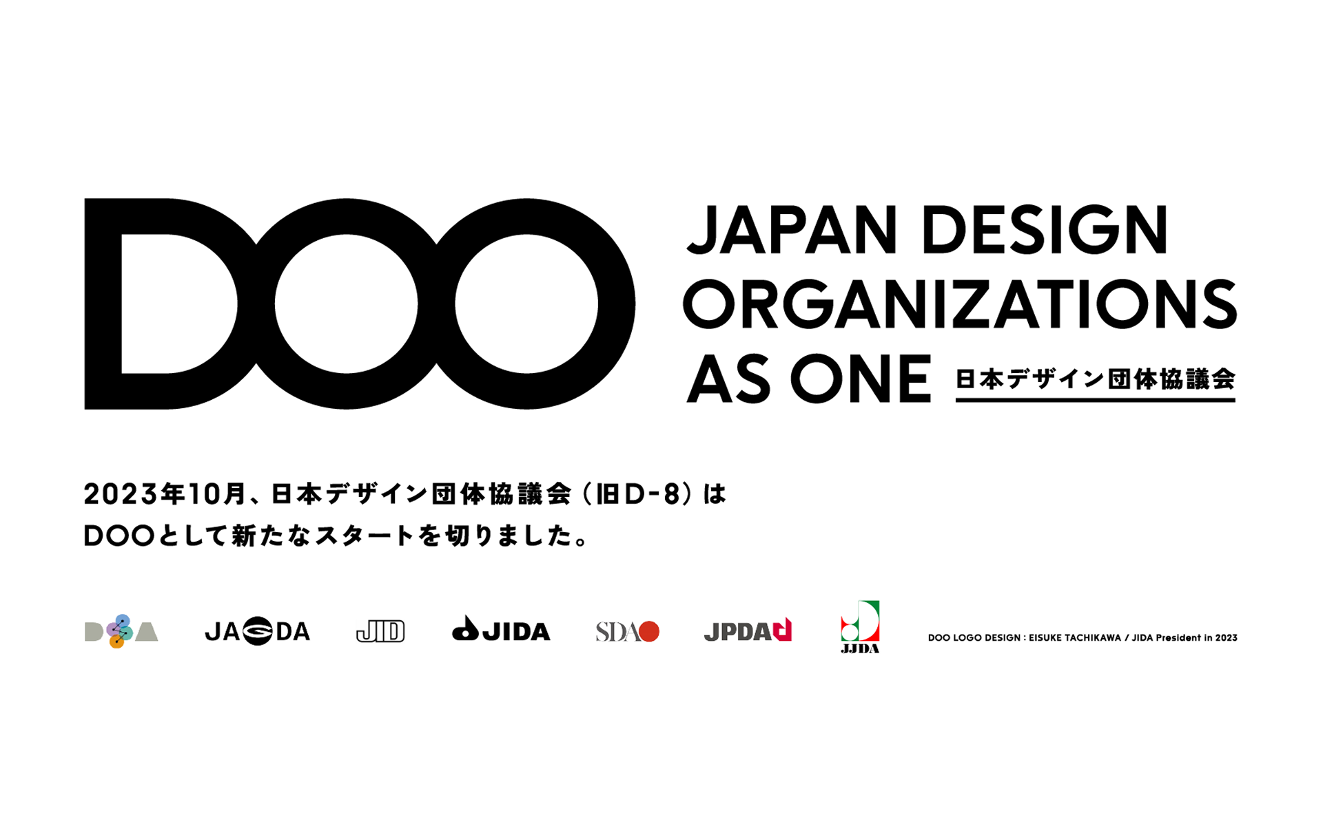 DOO的名稱來自「JAPAN DESIGN ORGANIZATIONS AS ONE」。將D8中的8旋轉90度變成「OO」(∞),象徵著無限的會員資格以及致力於跨越界限連結多元設計組織的承諾。NOSIGNER提出了縮寫和英文名稱並設計了標誌。