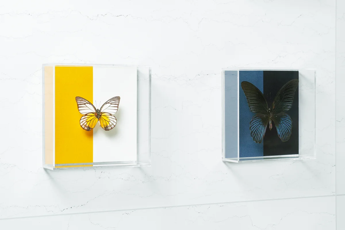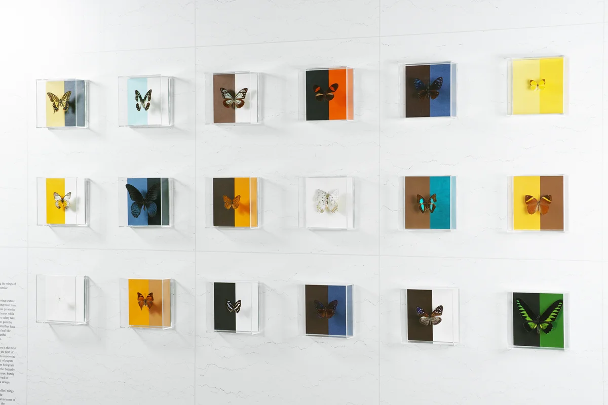 這是一個比較真實蝴蝶翅膀與具有相似質感紙張的觀察實驗。蝴蝶的翅膀質感和色彩有著無數種變化。牠們通過調整自身形態來適應環境而得以生存:那些生活在靠近天敵環境中的蝴蝶會模仿枯葉等物體,而那些生活在相對安全環境中的蝴蝶則採用魅力十足的對比形態,以在繁殖中獲得優勢。因此,蝴蝶發展出了各種特徵,從像葉子般的橡葉蝶翅膀到美麗的閃蝶結構色彩。