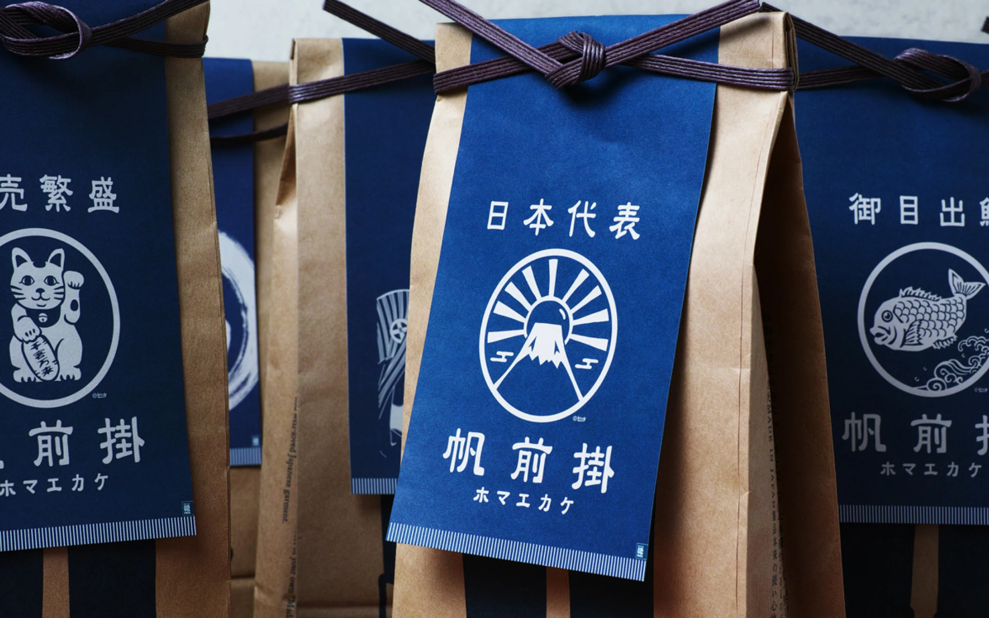 現存する唯一の一号前掛け製造工場の職人とともにつくる前掛けブランド「エニシング」のパッケージをデザインしました。これまで同ブランドでは、Tシャツを販売するように前掛けをビニールで包装していましたが、折り畳まれた状態になるため全体の柄が確認できないことはもちろん、一号前掛けならではの質感を確認することもできず、時には前掛けであることすら認識されないケースも少なからずありました。一方、スペース上の問題などから、店頭の壁などにディスプレイすることも難しい中、私たちは前掛けの販売にイノベーションを起こすことを目指し、商品と同じ絵柄がプリントされたミニチュアの前掛けを、足だけが印刷された米袋に貼り付けたパッケージを提案しました。これらが店頭に並ぶことによって、ブランドの多彩なラインナップと着用時のイメージを同時に伝えることが可能になりました。さらに、後ろ側には小さな穴を開け、前掛けの質感も確認できるようにするなど購買体験の価値を向上させるとともに、パッケージの脱プラスチックによって環境負荷の削減を実現するサステナブルなデザインになっています。